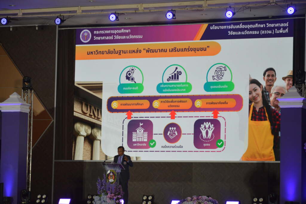 ***มหาวิทยาลัยราชภัฏเชียงราย ได้นำเสนอผลการดำเนินงานด้าน อววน. ผ่านการดำเนินงานทั้งด้านการจัดการศึกษาในระดับต่างๆ ที่เชื่อมโยงกับความต้องการของผู้เรียนในท้องถิ่น การพัฒนางานวิจัย การสร้างสรรค์นวัตกรรม และการบริการวิชาการในพื้นที่จังหวัดเชียงราย ซึ่งสอดคล้องกับแผนพัฒนาจังหวัดเชียงรายในการเป็นเมืองท่องเที่ยวสร้างสรรค์ โดยเฉพาะโครงการยกระดับเศรษฐกิจสร้างสรรค์ (Creative Economy) ในพื้นที่เทศบาลนครเชียงราย ที่มหาวิทยาลัยราชภัฏเชียงราย ได้เข้าไปมีส่วนร่วมในการพัฒนาเมือง ทั้งในด้านการศึกษา เศรษฐกิจ สังคม และสิ่งแวดล้อม รวมถึงการผลักดันผลงานวิจัยจากอัตลักษณ์ของศิลปวัฒนธรรมท้องถิ่น สู่การเป็นซอฟต์พาวเวอร์ของจังหวัดเชียงราย