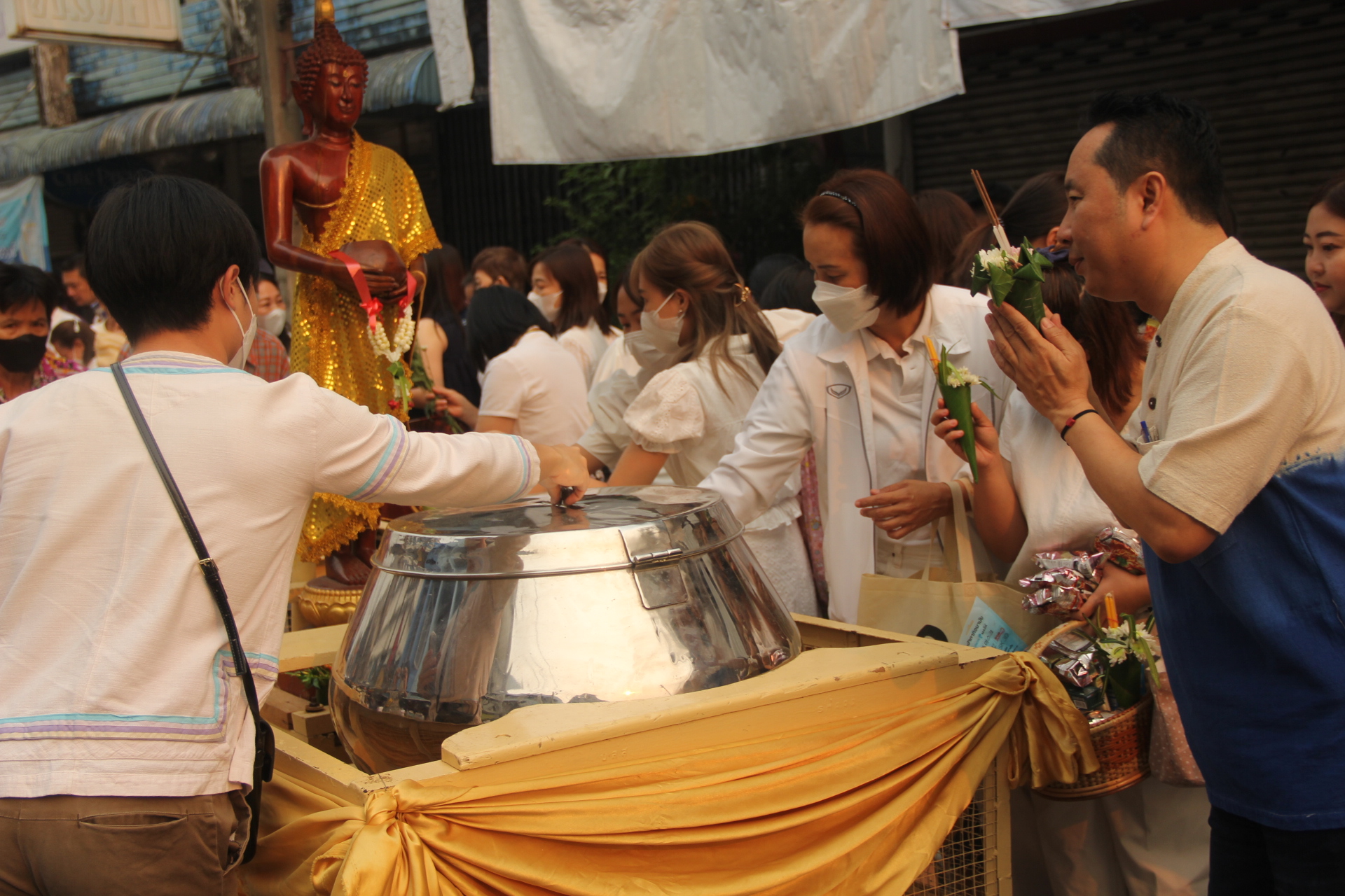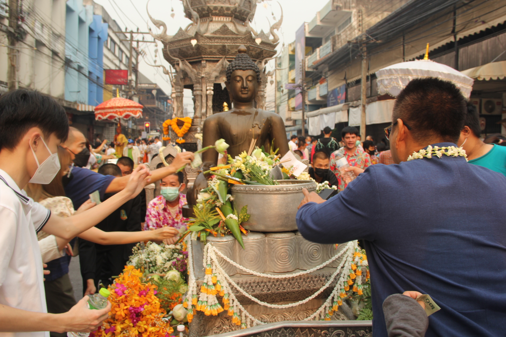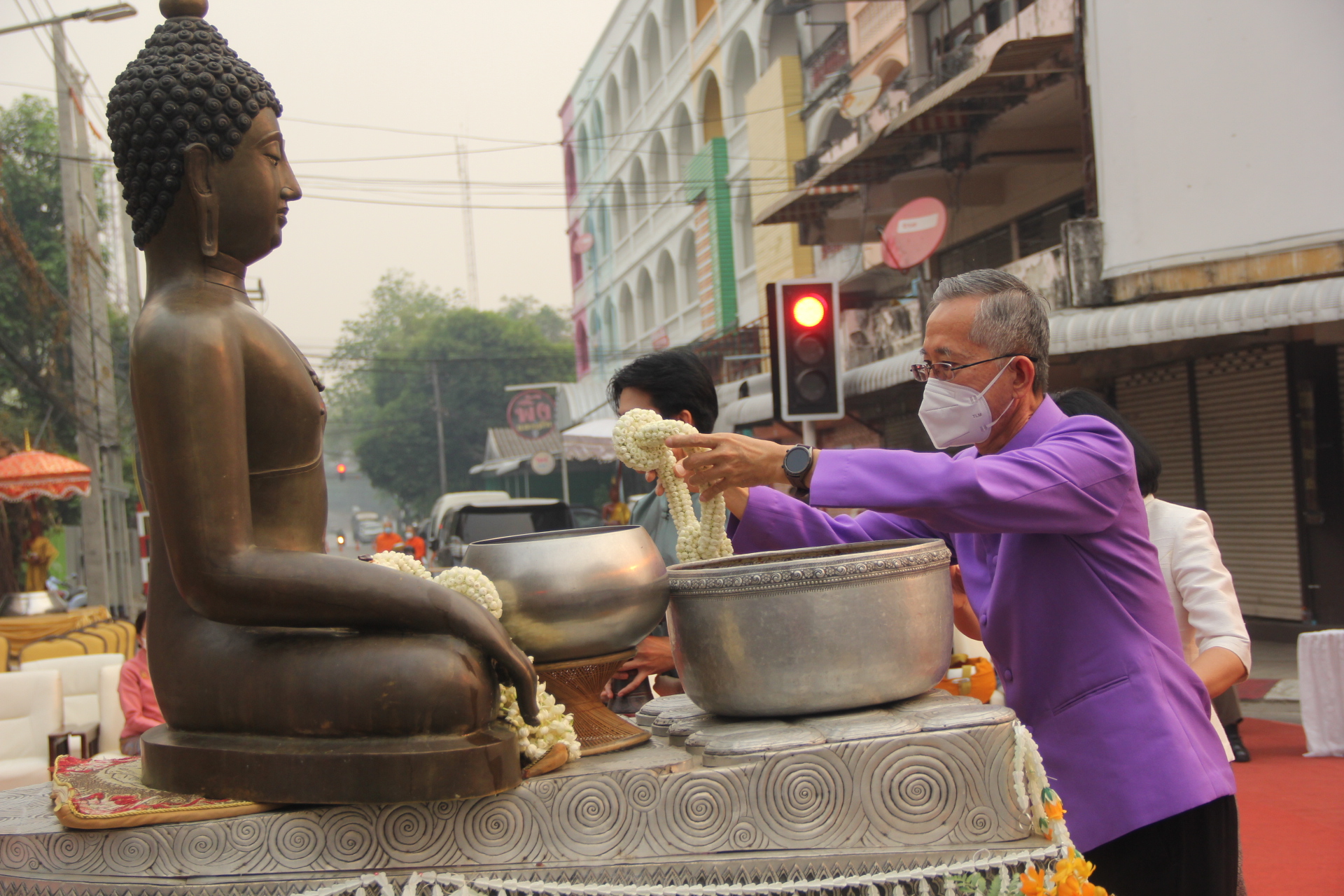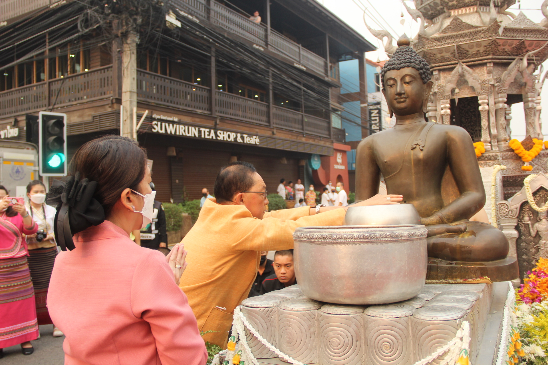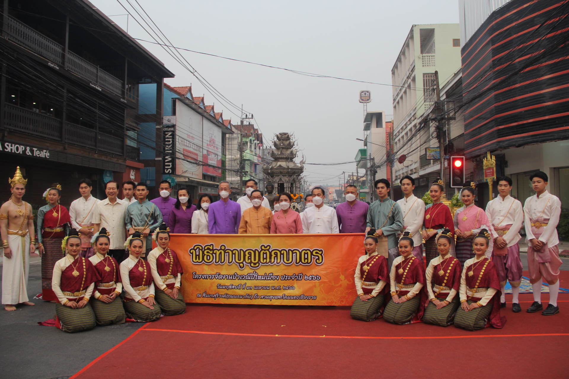 ***เมื่อเวลา 07.00 น. วันที่ 13 เม.ย.2566 วันตรุษสงกรานต์ ที่แยกสุริวงศ์ ถนนธนาลัย ต.เวียง อ.เมืองเชียงราย นายพุฒิพงษ์ ศิริมาตย์ ผวจ.เชียงราย พร้อมด้วยนายวราดิศร อ่อนนุช รองผวจ.เชียงราย รางสุภาเพ็ญ ศิริมาตย์ นายกเหล่ากาชาดจังหวัดเชียงราย ร่วมพิธีทำบุญตักบาตรในเทศกาลประเวณีปีใหม่เมือง จ.ศ.1385 โดยมีนายวันชัย จงสุทธานามณี นายกเทศมนตรีนครเชียงราย พร้อมคณะผู้บริหารให้การต้อนรับและร่วมพิธี มีพระรัตนมุนี,ศาตราจารย์ ด็อกเตอร์ ที่ปรึกษาเจ้าคณะจังหวัดเชียงรายและเจ้าอาวาสวัดพระแก้วเชียงราย นำประชาชนสวดบูชาพระรัตนไตร แสดงสัมโมทนียกถาอำนวยพรปีใหม่เมือง และนำบิณฑบาตข้าวสารอาหารแห้งจากประชาชนที่มาร่วมพิธีจำนวนมากกว่า 800 คน ตลอดถนนธนาลัยถึงแยกศาลจังหวัดเชียงราย ความยาวกว่า 500 เมตร