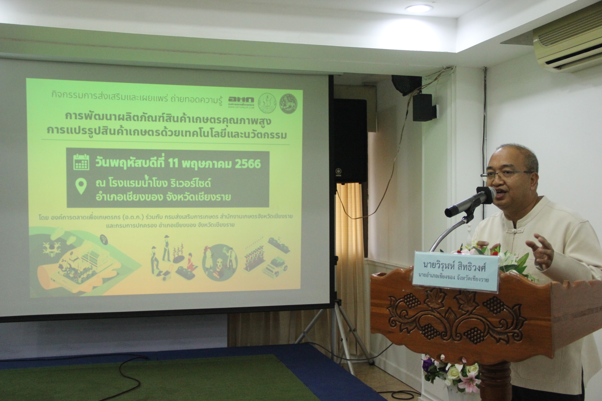 ***สำหรับการจัดกิจกรรมถ่ายทอดความรู้ครั้งนี้เป็นการบูรณาการความร่วมมือระหว่างองค์การตลาดเพื่อเกษตรกร กรมส่งเสริมการเกษตร และกรมการปกครอง อำเภอเชียงของ จังหวัดเชียงราย เพื่อถ่ายทอดองค์ความรู้การผลิตพัฒนาผลิตภัณฑ์เกษตรให้มีคุณภาพมีมาตรฐานโดยวิธีการแปรรูปสินค้า และพัฒนาบรรจุภัณฑ์ให้เหมาะสมกับผลผลิตโดยใช้เทคโนโลยี และนวัตกรรมตลอดจน การให้ความรู้ด้านการตลาดช่องทางการจัดจำหน่ายทั้งนี้เพื่อยกระดับสินค้าเกษตร ให้มีคุณภาพระดับส่งออก และสามารถแข่งขันในตลาดโลกได้