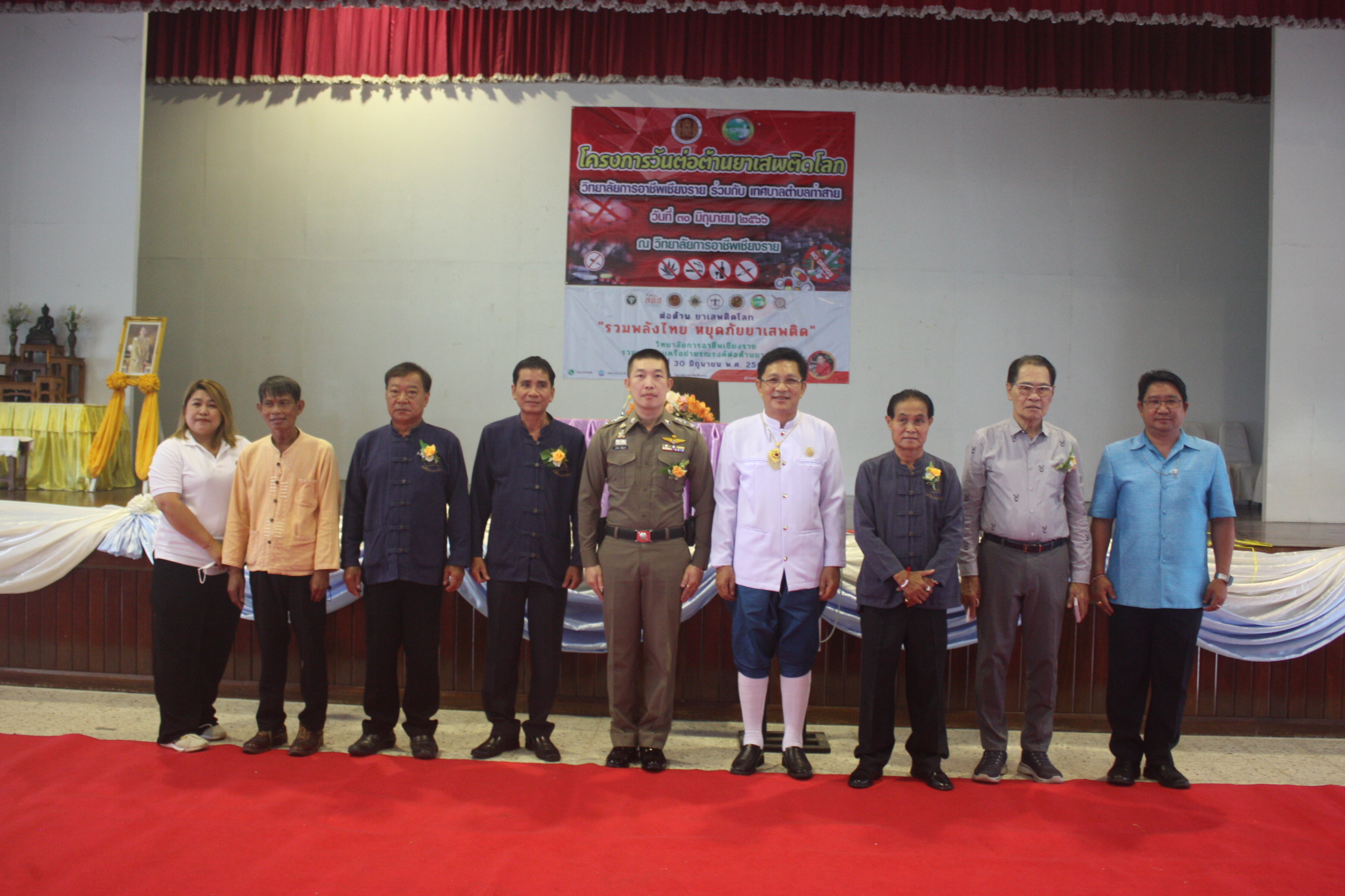 ***เมื่อเวลา 10.00 น. วันที่ 30 มิ.ย.2566 ที่ห้องประชุม วิทยาลัยการอาชีพ อาคารเฉลิมพระเกียรติ ชั้น 3 นายวิจิตร เกิ้งบุรี นายกเทศมนตรีเทศบาลตำบลท่าสาย เป็นประธานในพิธีเปิดโครงการวันต่อต้านยาเสพติดโลก ประจำปี 2566 ของวิทยาลัยการอาชีพเชียงราย เพื่อเผยแพร่ความรู้เกี่ยวกับโทษและพิษภัยของยาเสพติด รณรงค์ประชาสัมพันธ์การดำเนินงานของศูนย์ต่อสู้เพื่อเอาชนะยาเสพติด ในการป้องกันและปราบปรามยาเสพติด สนับสนุนและส่งเสริมให้คณะผู้บริหาร ครู อาจารย์ นักเรียน นักศึกษา ตระหนักถึงพิษภัยของยาเสพติดละช่วยกันประชาสัมพันธ์และป้องกันไม่ให้ยาเสพติดแพร่ระบาดเข้ามาในสถาบันการศึกษา โดยมี นายรชต ดิลกรัชตสกุล ผอ.วิทยาลัยการอาชีพเชียงราย กล่าวรายงาน ดร.ศรากร บุญปถัมภ์ ผอ.สำนักอาชีวศึกษาเชียงราย พ.ต.ท.ภูริวัฒ รุจิรัฐภาส รองผกก.สภ.เมืองเชียงราย นางชมภูนุช แพทยรัตน์ ผช.ผญบ.หมู่ 13 ต.ท่าสาย นายโชติศิริ ดารายน นายกสมาคมสื่อมวลชนและนักประชาสัมพันธ์ จังหวัดเชียงราย ร่วมกิจกรรม
