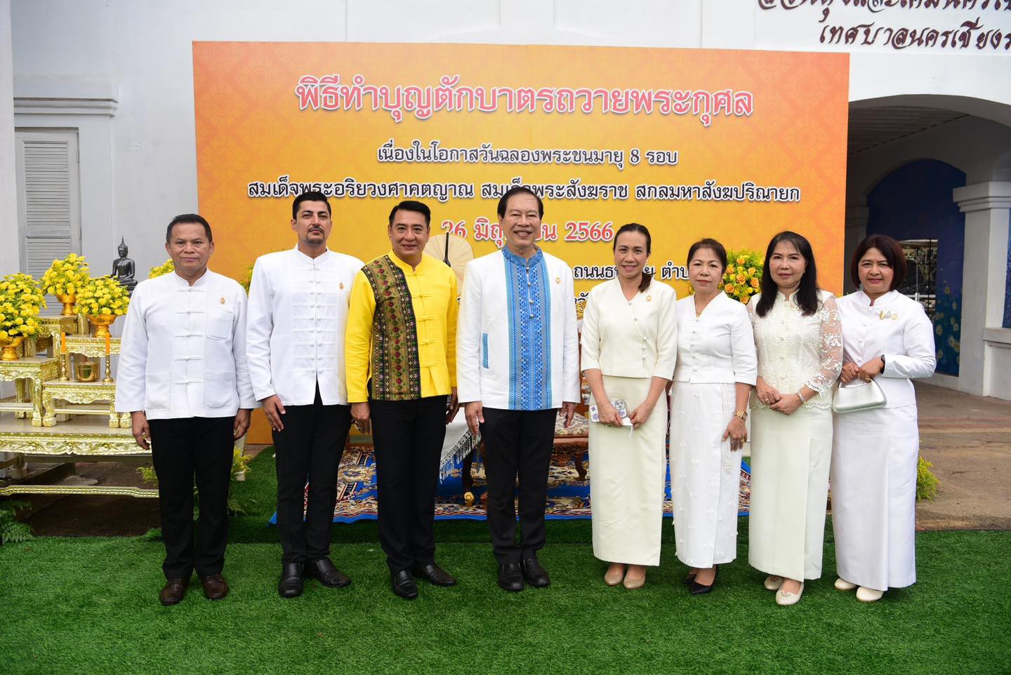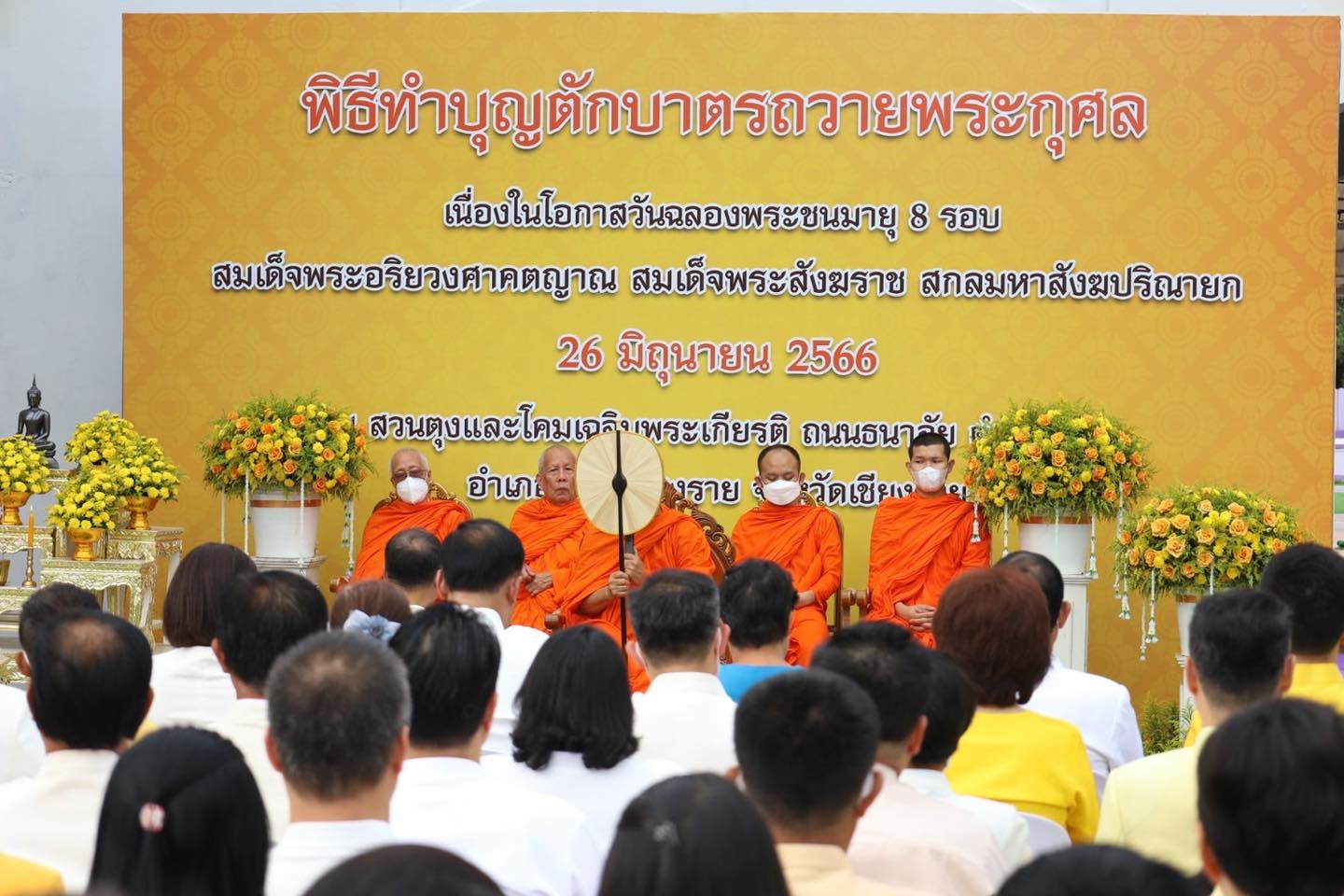 ***เมื่อวันที่ 26 มิถุนายน 2566 จังหวัดเชียงรายจัดโครงการและกิจกรรมเฉลิมพระเกียรติฯ และถวายพระกุศลให้เป็นไปอย่างสมพระเกียรติ ในโอกาสนี้เทศบาลนครเชียงราย โดยนายวันชัย จงสุทธานามณี นายกเทศมนตรีนครเชียงราย คณะผู้บริหาร ข้าราชการได้ร่วมพิธีทำบุญตักบาตรถวายพระราชกุศล เนื่องในโอกาสฉลองพระชนมายุ 8 รอบ สมเด็จพระอริยวงศาคตญาณ สมเด็จพระสังฆราช สกลมหาสังฆปริณายก ทรงเจริญพระชนมายุ 8 รอบ โดยมีนายสมหวัง บุญระยอง รองผู้ว่าราชการจังหวดเชียงราย เป็นประธาน พร้อมหัวหน้าส่วนราชการ เจ้าหน้าที่ และประชาชนทุกหมู่เหล่าร่วมพิธีในการครั้งนี้ ในการนี้ พระพุทธิญาณมุนี เจ้าคณะจังหวัดเชียงราย ประธานฝ่ายสงฆ์ นำพระสงฆ์ สามเณร รวม 97 รูป ออกรับบิณฑบาตร ณ บริเวณสวนตุงและโคม เทศบาลนครเชียงราย