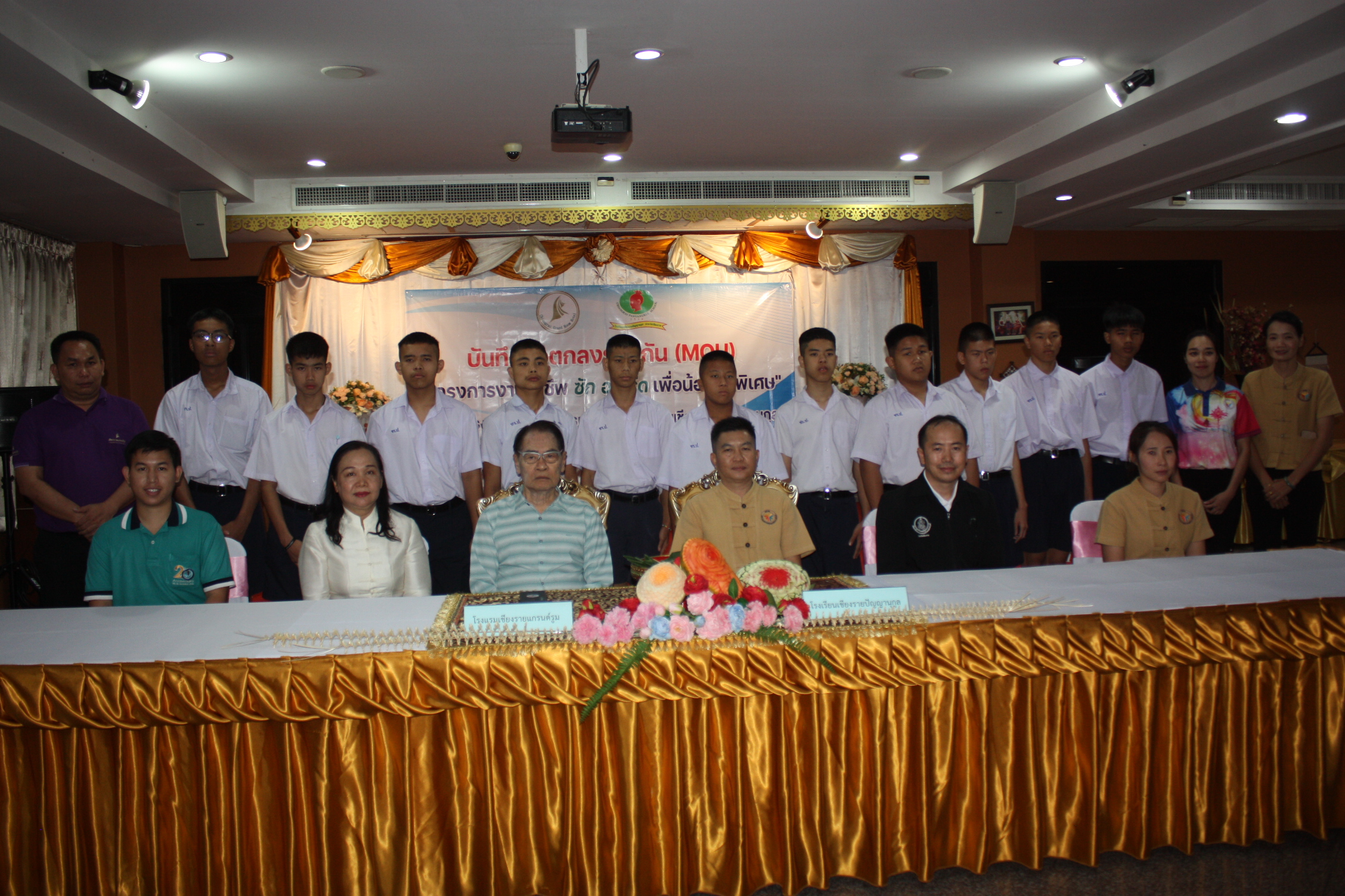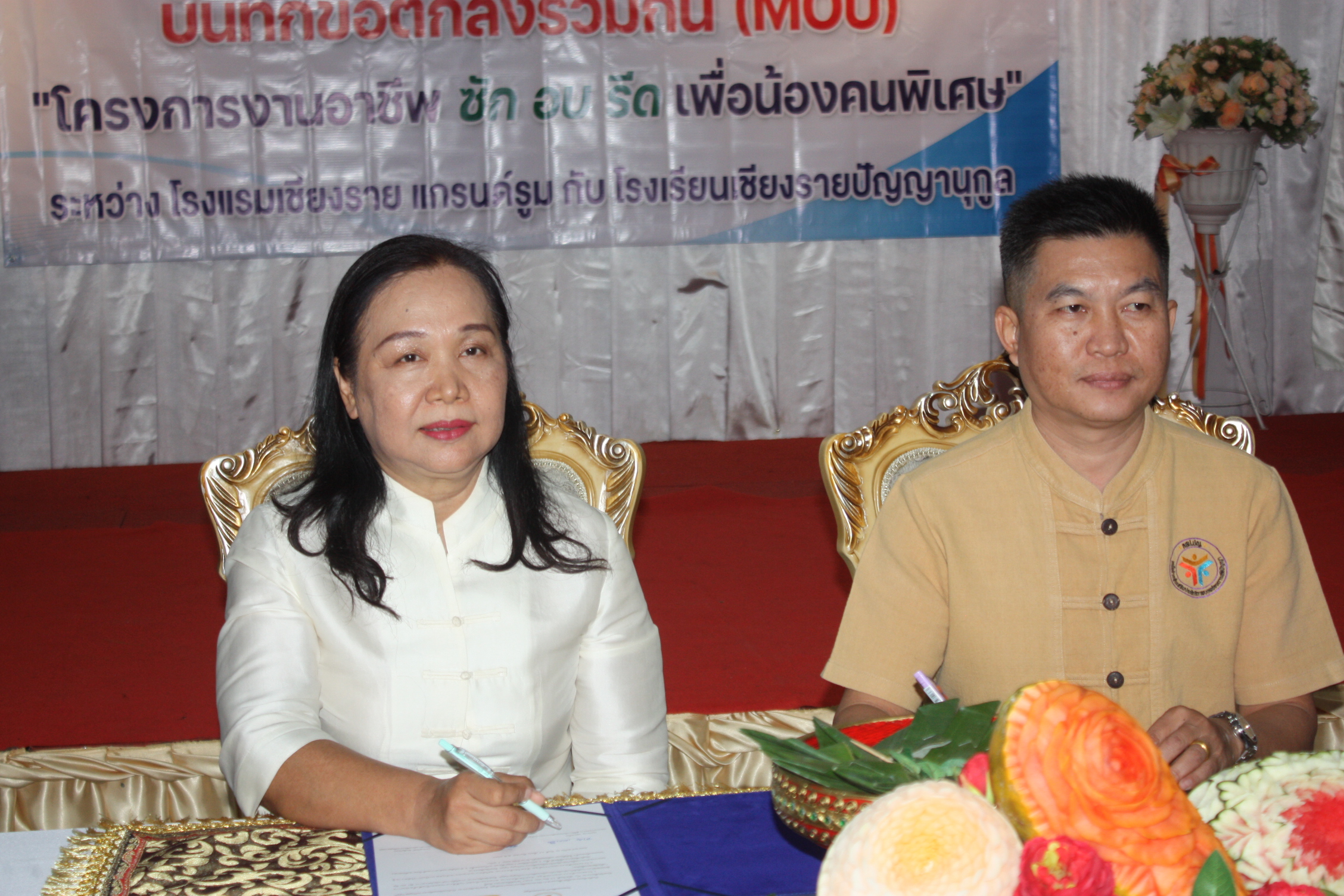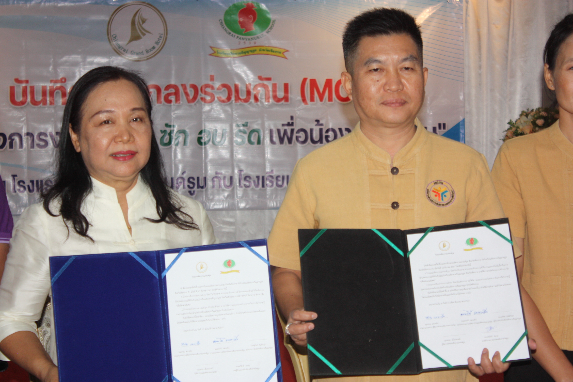 ***เมื่อเวลา 13.30 น. วันที่ 13 มีนาคม 2567 ที่ห้องมณฑา โรงแรมเชียงรายแกรนด์รูม อ.เมืองเชียงราย นายชาญ-นางดอกไม้ เพราะยิ่ง ประธานกรรมการบริหาร โรงแรมเชียงรายแกรนด์รูม มอบหมายให้นางอรสา เอื้อสามาลย์ ผู้จัดการทั่วไป โรงแรมเชียงรายแกรนด์รูม ร่วมกับนายทวีศักดิ์ มังกร รองผอ.โรงเรียนเชียงรายปัญญานุกูล ร่วมแถลงข่าว พิธีลงนามบันทึกความร่วมมือ (MOU) ระหว่างโรงแรมเชียงรายแกรนด์รูมและโรงเรียนเชียงรายปัญญานุกูล ใน“โครงการงานอาชีพซัก อบ รีด เพื่อน้องคนพิเศษ” โดยมีนายอัศวิน จุมปา ผู้อำนวยการศูนย์บริการคนพิการจังหวัดเชียงราย สำนักงานพัฒนาสังคมและความมั่นคงของมนุษย์ จังหวัดเชียงราย และนายโชติศิริ ดารายน นายกสมาคมสื่อมวลชนและนักประชาสัมพันธ์จังหวัดเชียงราย ร่วมเป็นสักขีพยาน