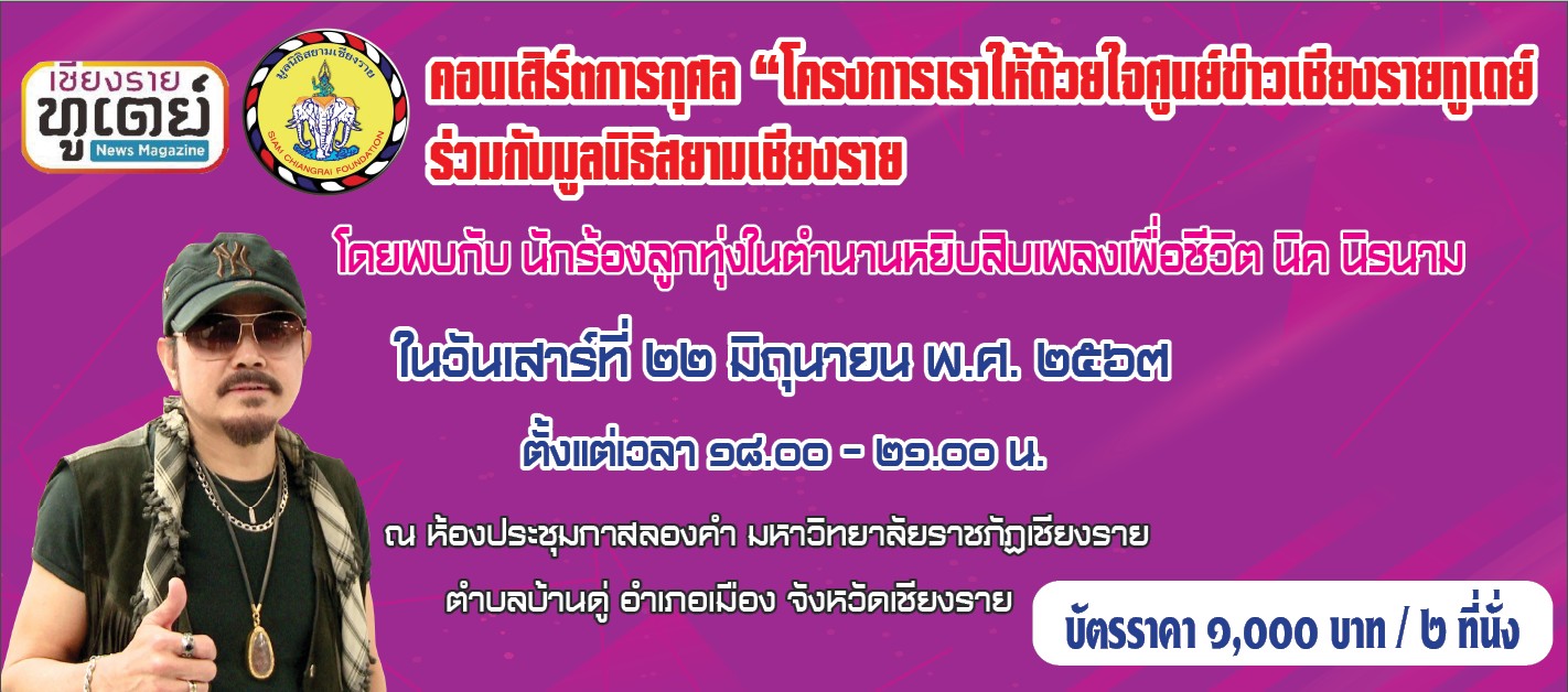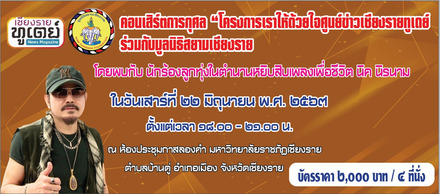 เชิญชมคอนเสิร์ตการกุศล “นิค นิรนาม” สมทบทุนมูลนิธิสยามเชียงราย ช่วยผู้ประสบภัยพิบัติและอุบัติเหตุ สมทบทุนมูลนิธิโรงพยาบาลสวนดอก ทุนการศึกษาให้นักเรียนยากจนในถิ่นทุรกันดาร