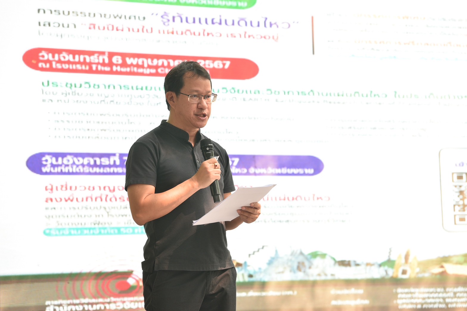 ***เมื่อเวลา 09.30 น. วันที่ 5 พ.ค.2567 รองผวจ.เชียงราย เป็นประธานเปิดงานกิจกรรมรำลึกถึง “1 ทศวรรษ แผ่นดินไหวแม่ลาว” จัดโดยสำนักงานการวิจัยแห่งชาติ (วช.) กระทรวงการอุดมศึกษา วิทยาศาสตร์ วิจัยและนวัตกรรม ร่วมกับ ศูนย์วิจัยแผ่นดินไหวแห่งชาติ มูลนิธิมดชนะภัย และหน่วยงานที่เกี่ยวข้อง เพื่อรำลึกถึง 10 ปีที่ผ่านมาของการเกิดแผ่นดินไหวครั้งใหญ่ที่ อ.แม่ลาว จ.เชียงราย แรงสั่นสะเทือน 6.3 แมกนิจูด มีรศ.ดร.สุทธิศักดิ์ ศรลัมพ์ ประธานมูลนิธิมดชนะภัย กล่าวต้อนรับและกล่าวรายงาน ศ.ดร.เป็นหนึ่ง วานิชชัย ผู้อำนวยการศูนย์วิจัยแผ่นดินไหวแห่งชาติ ดร.วีระชาติ วิเวกวิน กรมทรัพยากรธรณี นางอรภา สอาดเอี่ยม ตัวแทน จากศูนย์ป้องกันและบรรเทาสาธารณภัยเขต 15 จ.เชียงราย เป็นวิทยากรบรรยายให้ข้อมูลด้านแผ่นดินไหว พร้อมด้วยผู้แทนจาก กรมอุตุนิยมวิทยา กรมโยธาธิการและผังเมือง กรมชลประทาน ผู้ที่เกี่ยวข้องและประชาชนในพื้นที่เข้าร่วมงาน