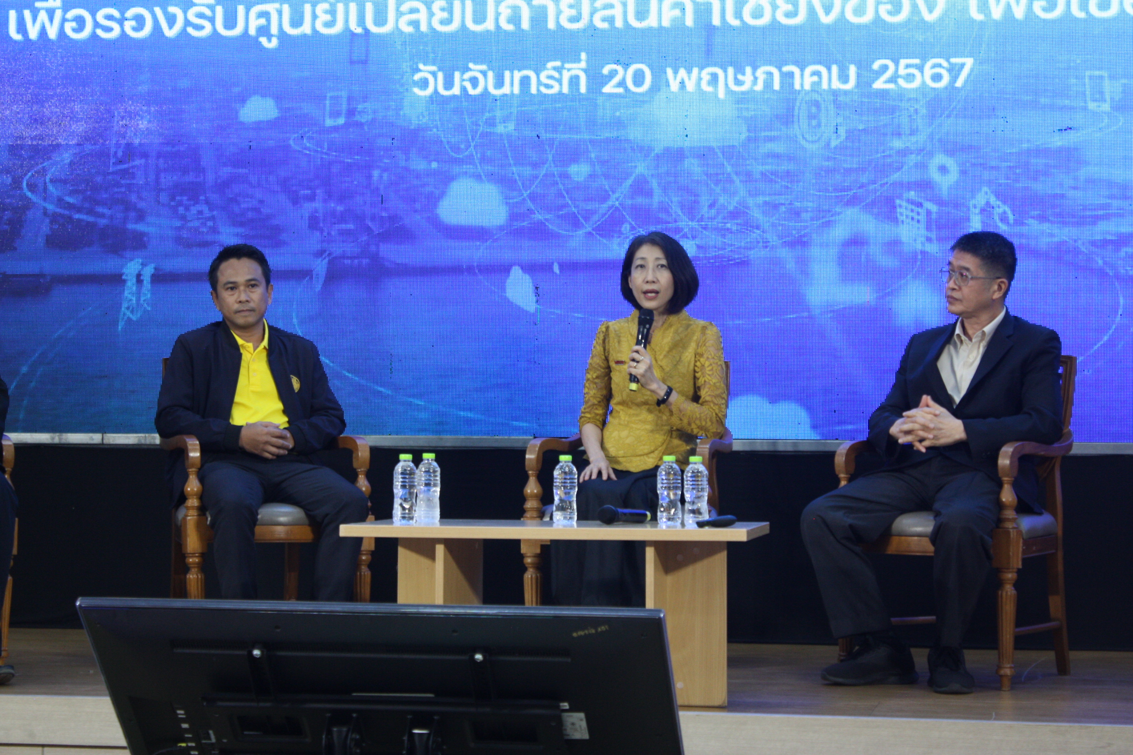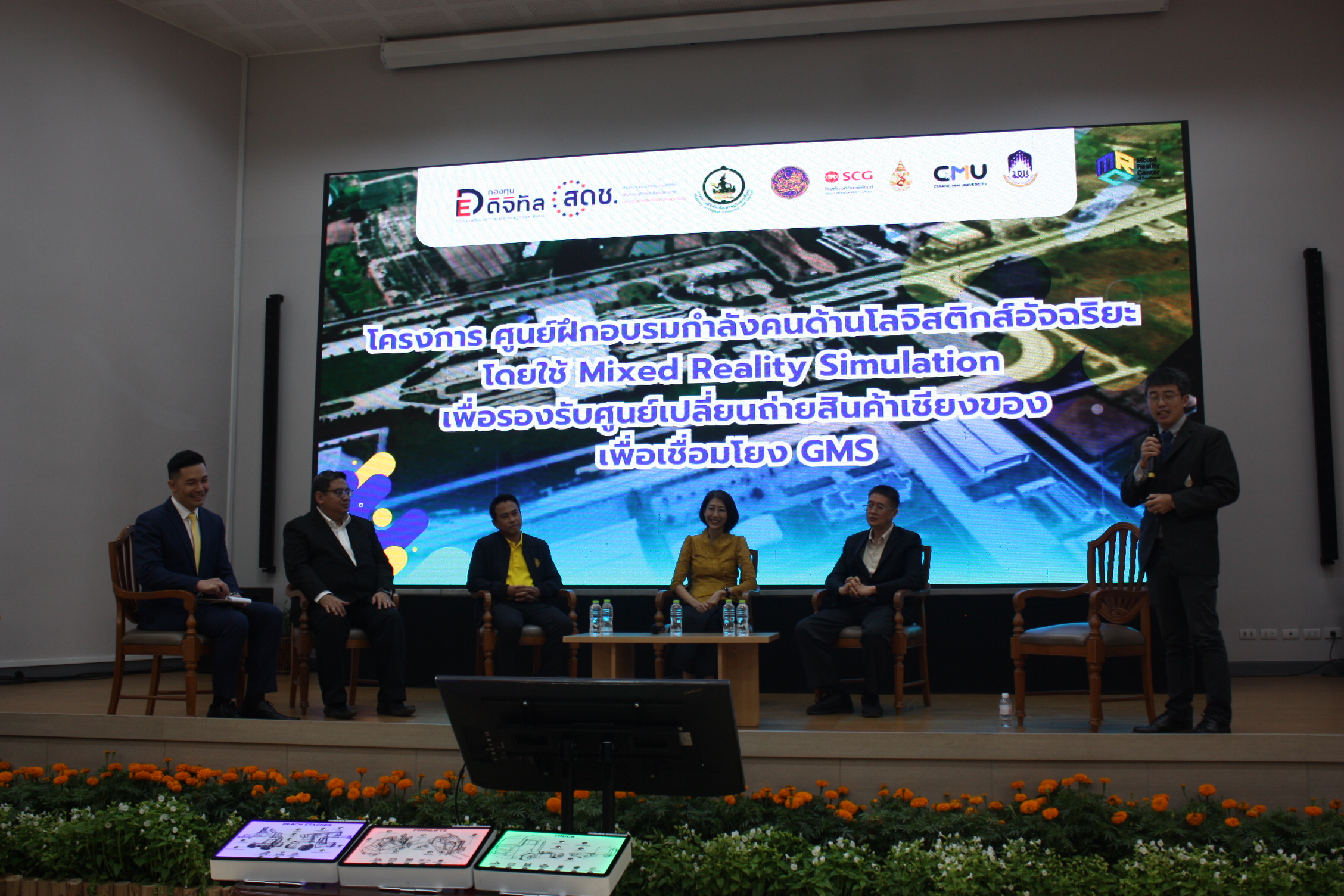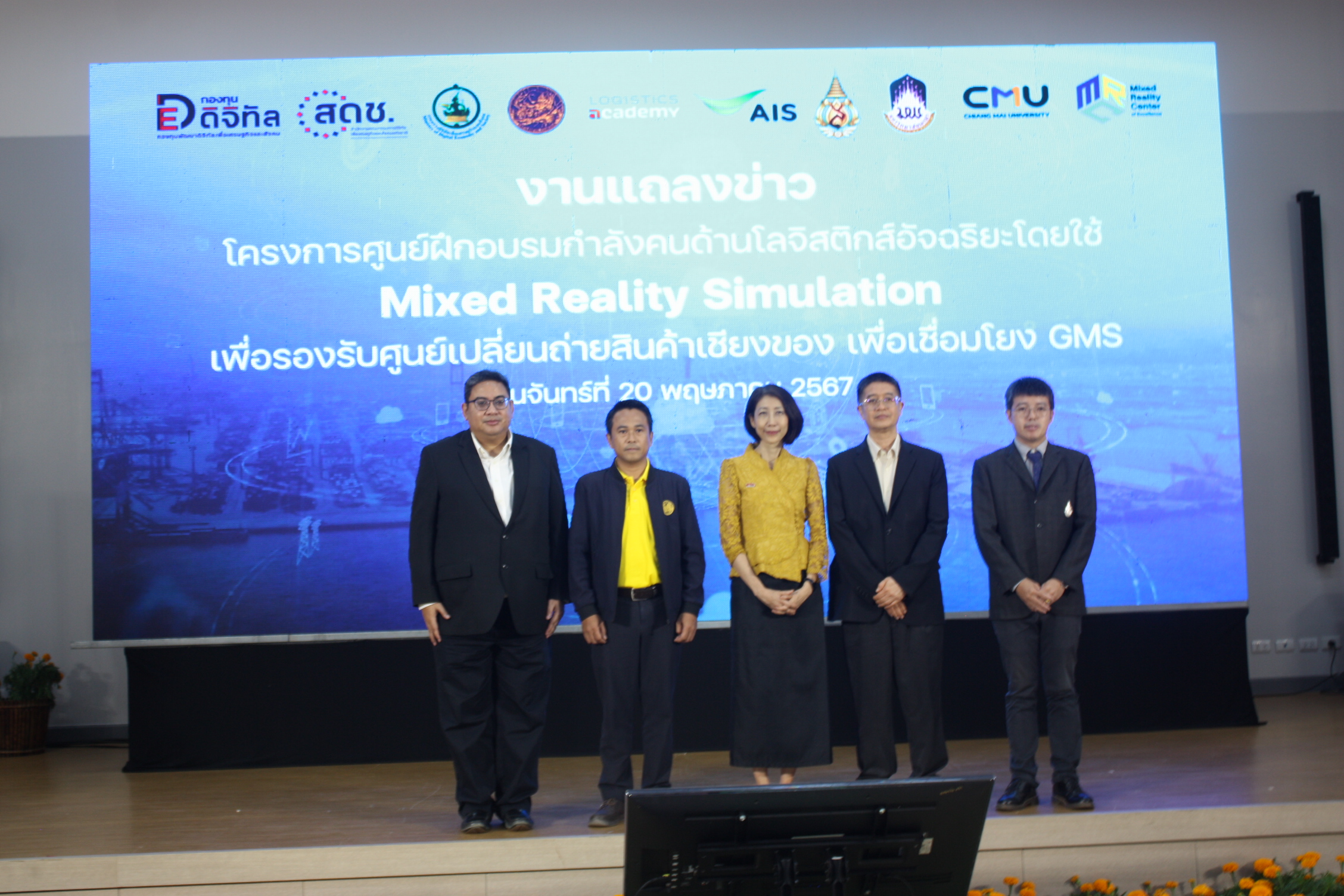 ***เมื่อเวลา 09.30 น. วันที่ 20 พ.ค.2567 ที่ห้องระชุมประดู่แดง 1 อาคารพลเอกสำเภา ชูศรี (E4) มหาวิทยาลัยแม่ฟ้าหลวง (มฟล.) อ.เมืองเชียงราย สำนักวิชาเทคโนโลยีสารสนเทศ มฟล. ร่วมกับกรมการขนส่งทางบก SCG JWD Academy ร่วมแถลงข่าวโครงการศูนย์ฝึกอบรมกำลังคนด้านโลจิสติกส์อัจฉริยะโดยใช้ Mixed Reality Simulation เพื่อรองรับศูนย์เปลี่ยนถ่ายรูปแบบการขนส่งสินค้าเชียงของ เพื่อเชื่อมโยง GMS เนื่องจากในปัจจุบันศูนย์เปลี่ยนถ่ายฯ ตั้งอยู่บริเวณด่านพรมแดนไทย-สปป.ลาว อ.เชียงของ จ.เชียงราย เนื้อที่ 335 ไร่ โดยดำเนินการด้านโครงสร้างพื้นฐานระยะที่ 1 แล้วเสร็จแล้วด้วยวงเงิน 1,300 ล้านบาท ปัจจุบันอยู่ระหว่างดำเนินการระยะที่ 2 วงเงิน 660 ล้านบาท โดยอยู่ในกระบวนการคัดเลือกเอกชน (PPP) เข้าบริหารงาน โดยมีรศ.ดร.ดรุณี วัฒนศิริเวช รองอธิการบดี มฟล.ผศ.ดร.ธีรวิศิฎฐ์ เลาหะเพ็ญแสง คณบดีสำนักวิทยาเทคโนโลยีสารสนเทศ ผศ.ดร.สันติชัย วิชา หัวหน้าโครงการฯ นายณัฐกฤต แก้วประทุม นักวิชาการขนส่งชํานาญการ คุณสรนพ บ้านใหญ่ SCGJWD Academy ร่วมสรุปผลการดำเนินการโครงการซึ่งได้รับการสนับสนุนจากสำนักงานคณะกรรมการดิจิทัลเพื่อเศรษฐกิจและสังคมแห่งชาติจำนวน 9,700,800 บาท เพื่อพัฒนากำลังคนที่จะสามารถทำงานรองรับกับศูนย์เปลี่ยนถ่ายฯ ได้ในอนาคต อีกทั้งได้รับความร่วมมือจากภาครัฐและเอกชน ได้แก่ กรมการขนส่งทางบก โรงเรียนทักษะพิพัฒน์หรือ SCGJWD Academy บริษัท แอดวานซ์ อิน โฟร์ เซอร์วิส จำกัด (มหาชน), มหาวิทยาลัยเชียงใหม่ และมหาวิทยาลัยพะเยา
