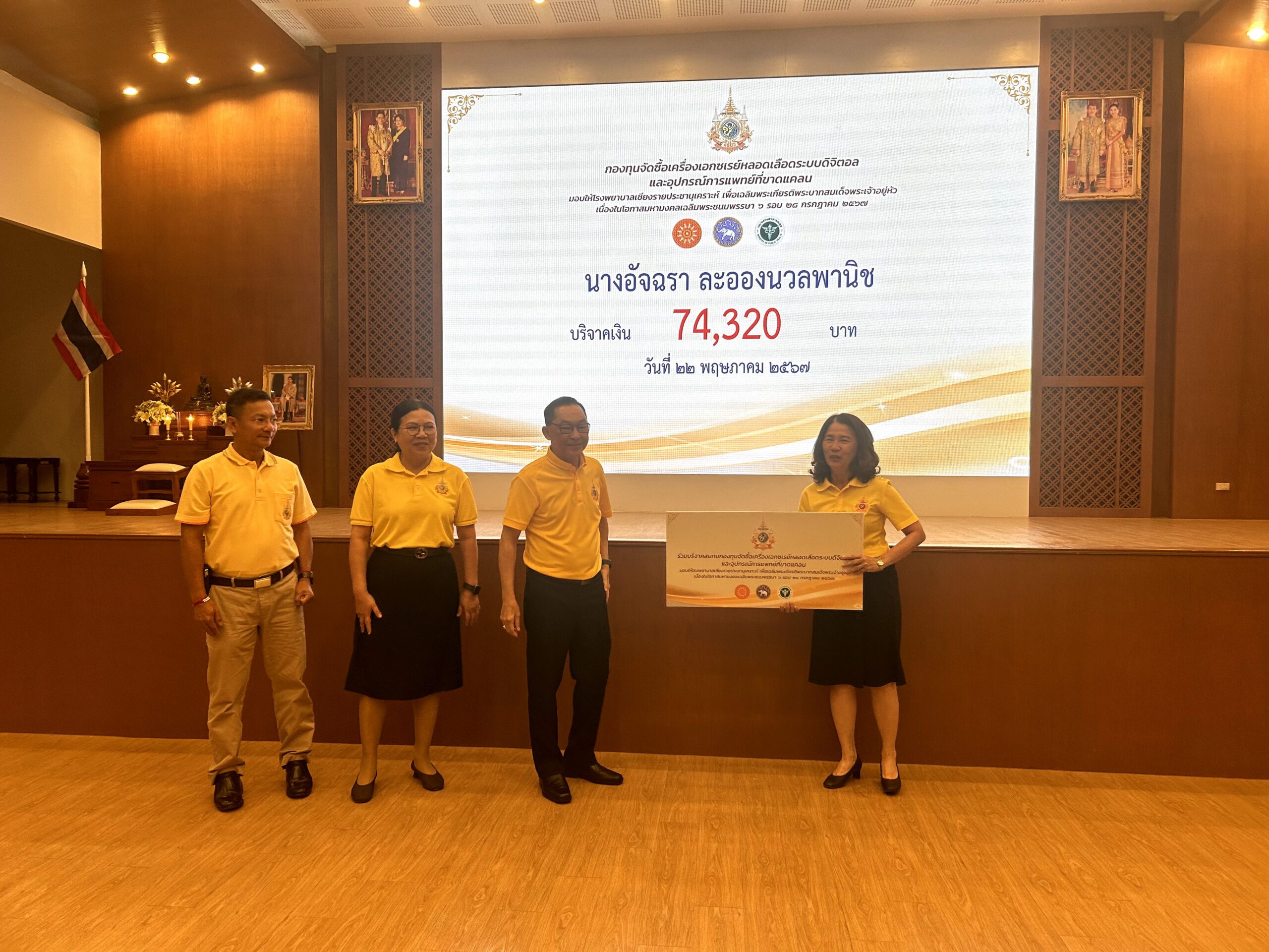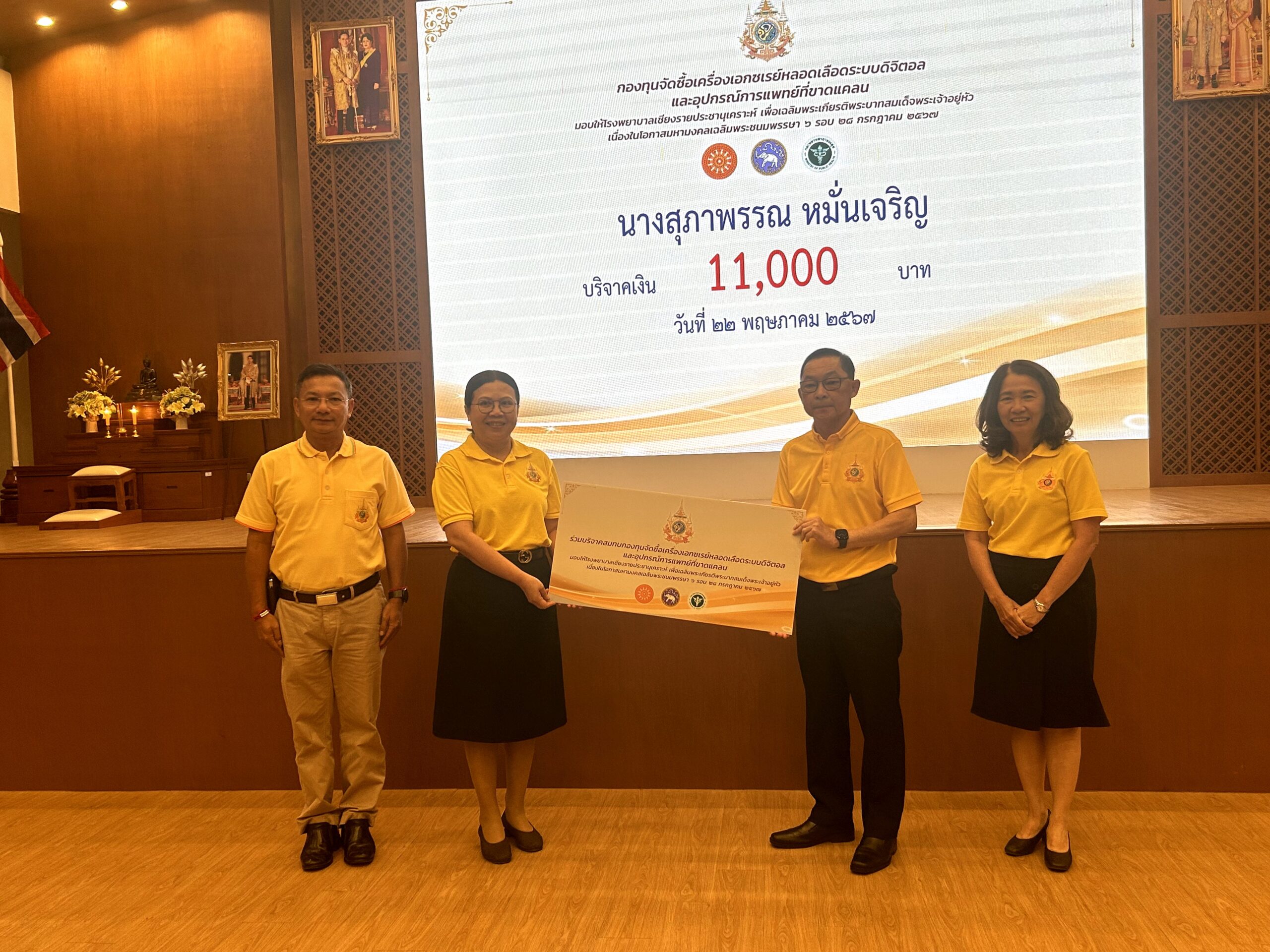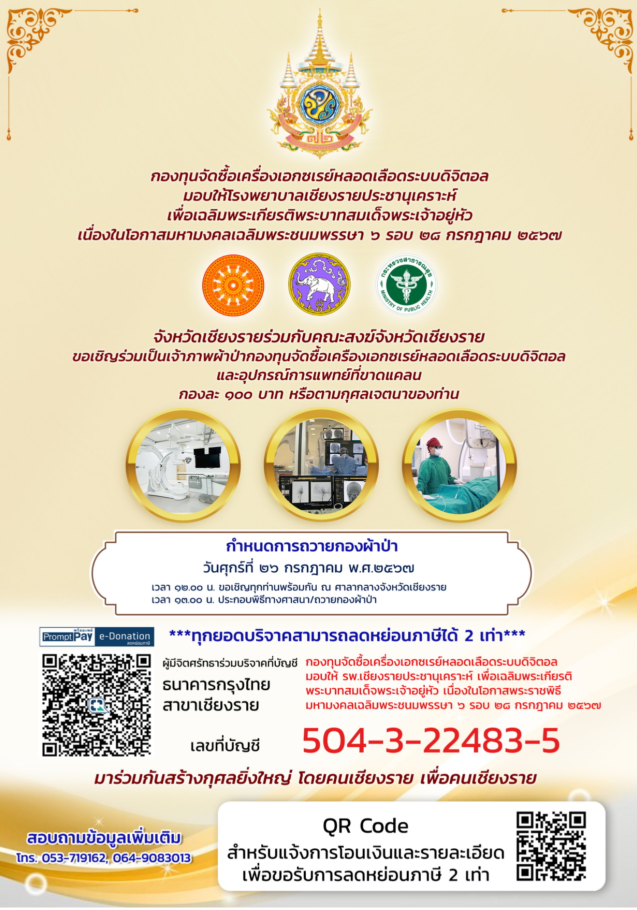 ***สรุปยอดบริจาค ณ วันที่ 22 พ.ค.2567 มีจำนวน 9,196,128.67 บาท และในช่วงการแถลงข่าว มีภาคเอกชน ส่วนราชการ บริษัทห้างร้าน และผู้มีจิตศรัทธาได้ร่วมบริจาคเพิ่มอีกจำนวน 5 ล้านบาท ทั้งนี้ได้กำหนดการถวายกองผ้าป่าในวันศุกร์ที่ 26 กรกฎาคม 2567 เวลา 13.00 น. ณ ศาลากลางจังหวัดเชียงราย ผู้มีจิตศรัทธาสามารถร่วมบริจาคเพื่อสมทบทุนได้ที่ ธนาคารกรุงไทย สาขาเชียงราย ชื่อบัญชี กองทุนจัดซื้อเครื่องเอกซเรย์หลอดเลือดระบบดิจิตอล เลขบัญชี 504-3-22483-5 ยอดทุกบาทที่ร่วมเป็นเจ้าภาพในครั้งนี้สามารถนำไปลดหย่อนภาษีได้ 2 เท่า