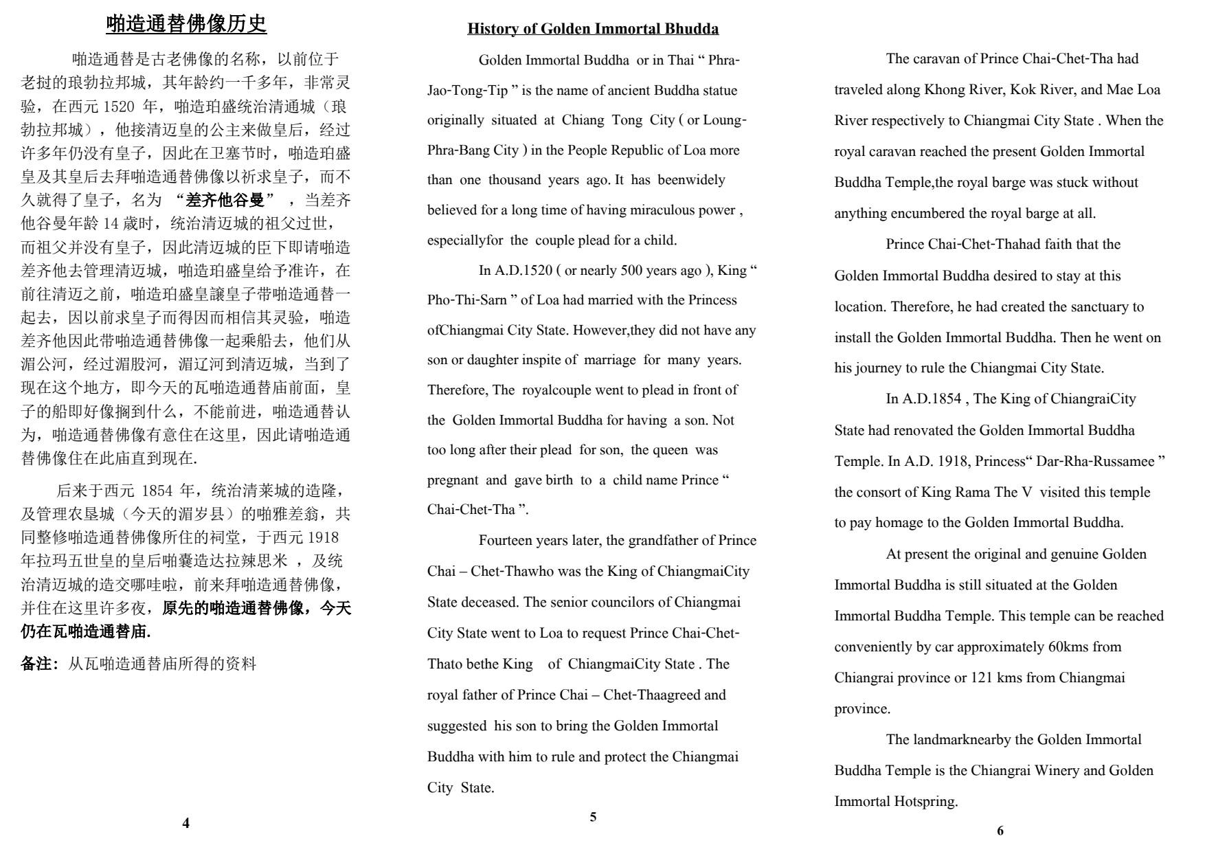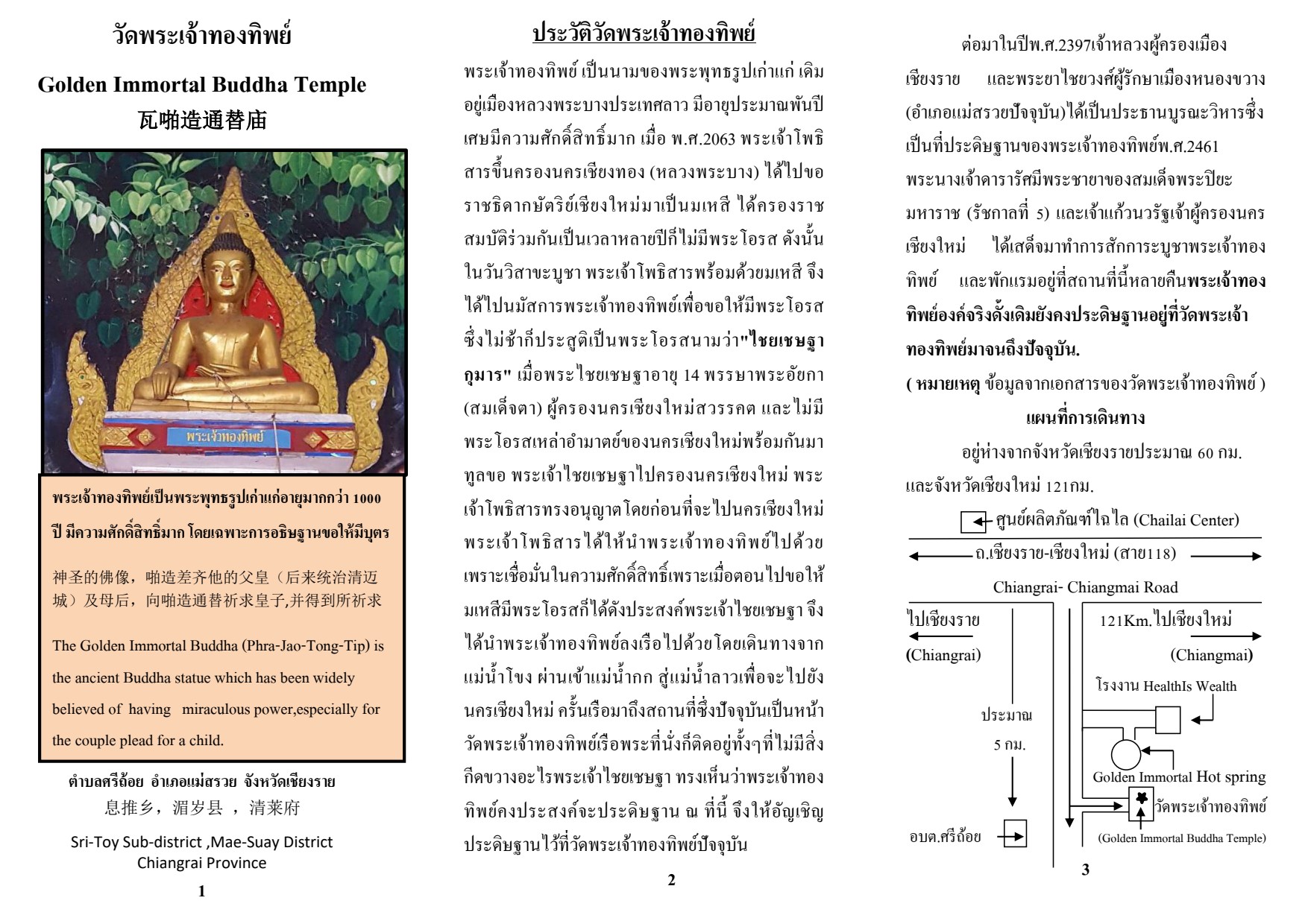 ***จากประวัติเหตุการณ์พระเจ้าไชยเชษฐาเสด็จทางชลมารคแม่น้ำลาวไปครองเมืองเชียงใหม่ และได้อัญเชิญพระพุทธรูปศักดิ์สิทธิ์ไปด้วย ครั้นเสด็จมาถึงตำบลศรีถ้อย อำเภอแม่สรวย บริเวณหน้าวัดพระเจ้าทองทิพย์ในปัจจุบัน เรือพระที่นั่งไม่สามารถเคลื่อนต่อได้ จึงได้อัญเชิญพระพุทธรูป ดังกล่าว ประทับ ณ ศาลาชั่วคราว ต่อมาได้มีการสร้างเป็นวัดพระเจ้าทองทิพย์ เดิมอยู่เมืองหลวงพระบางประเทศลาว มีอายุประมาณพันปีเศษ มีความศักดิ์สิทธิ์มาก เมื่อ พ.ศ. 2063 พระเจ้าโพธิสารขึ้นครองนครเชียงทอง (หลวงพระบาง) ได้ไปขอราชธิดากษัตริย์เชียงใหม่มาเป็นมเหสี และได้ครองราชสมบัติร่วมกันเป็นเวลาหลายปีแด่ก็ไม่มีพระโอรส ดังนั้นในวันวิสาขบูชา พระเจ้าโพธิสารพร้อมด้วยมเหสี จึงได้ไปบนบานศาลกล่าวต่อพระเจ้าทองทิพย์เพื่อขอให้มีพระโอรส ซึ่งต่อมาไม่นานมเหสีก็ตั้งครรภ์ และประสูติเป็นพระโอรสนามว่า “ไชยเชษฐากุมาร” ***เมื่อพระไชยเชษฐาอายุ 14 พรรษา พระอัยกา (สมเด็จตา) ผู้ครองนครเชียงใหม่สวรรคต และไม่มีพระโอรสเหล่าอำมาตย์ของนครเชียงใหม่พร้อมกันมาทูลขอพระเจ้าไชยเชษฐาไปครองนครเชียงใหม่ พระเจ้าโพธิสารทรงอนุญาต โดยก่อนที่จะไปนครเชียงใหม่ พระเจ้าโพธิสารให้นำพระเจ้าทองทิพย์ไปด้วยเพราะเชื่อมั่นในความศักดิ์สิทธิ์ ดังเมื่อตอนไปขอให้มเหสีมีพระโอรสก็ได้ดังประสงค์ พระเจ้าไชยเชษฐา จึงได้นำพระเจ้าทองทิพย์ลงเรือไปด้วย โดยเดินทางจากนครเชียงทอง (หลวงพระบาง) ผ่านแม่น้ำโขง แม่น้ำกก สู่แม่น้ำลาว เพื่อจะไปยังนครเชียงใหม่ ครั้นเรือล่องมาถึงหน้าวัดพระเจ้าทองทิพย์ในปัจจุบัน เรือพระที่นั่งไม่สามารถเคลื่อนต่อได้ ทั้งๆ ที่ไม่มีสิ่งกีดขวาง พระเจ้าไชยเชษฐา ทรงเห็นว่าพระเจ้าทองทิพย์ คงประสงค์จะประดิษฐาน ณ ที่แห่งนี้ จึงให้อัญเชิญมาประดิษฐานไว้ที่วัดพระเจ้าทองทิพย์ปัจจุบัน