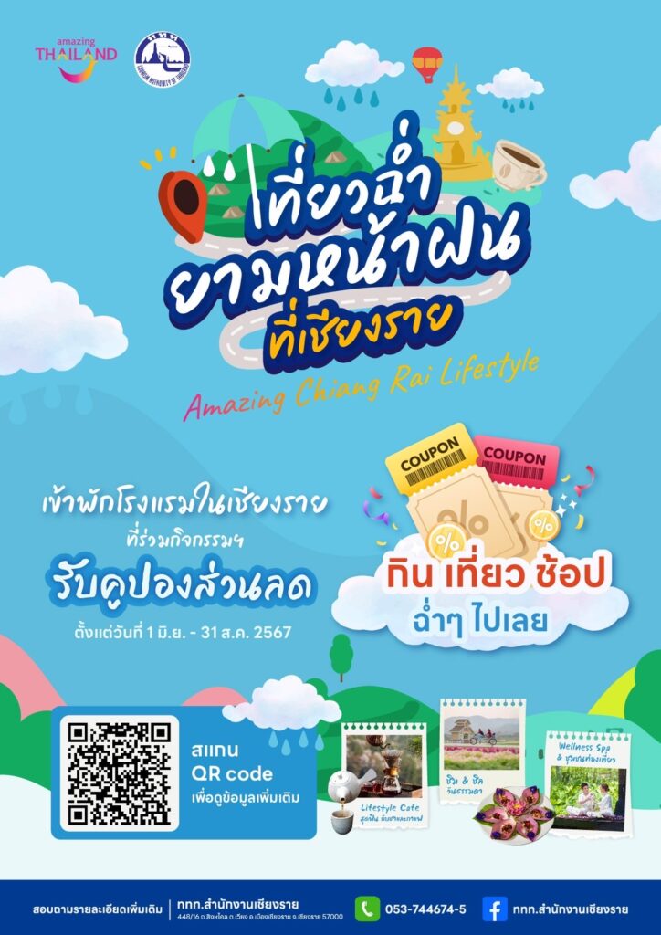 ***แคมเปญเชียงราย “เที่ยวฉ่ำยามหน้าฝนที่เชียงราย” รับ “ฟรี” คูปองส่วนลดค่าใช้จ่ายสินค้าและบริการทางการท่องเที่ยว ใช้สิทธิ์ร้านคาเฟ่ ร้านอาหาร สปา กิจกรรมท่องเที่ยว กิจกรรมท่องเที่ยวชุมชน รวมจำนวนกว่า 80 แห่ง ระยะเวลาใช้สิทธิ์ : วันที่ 1 มิถุนายน – 31 สิงหาคม 2567 จำกัดเพียง : 3,000 สิทธิ์ ตามเงื่อนไขที่ ททท. กำหนด พิเศษสำหรับนักท่องเที่ยวต่างจังหวัดที่พักค้างในโรงแรมที่ร่วมกิจกรรมฯกว่า 40 แห่ง