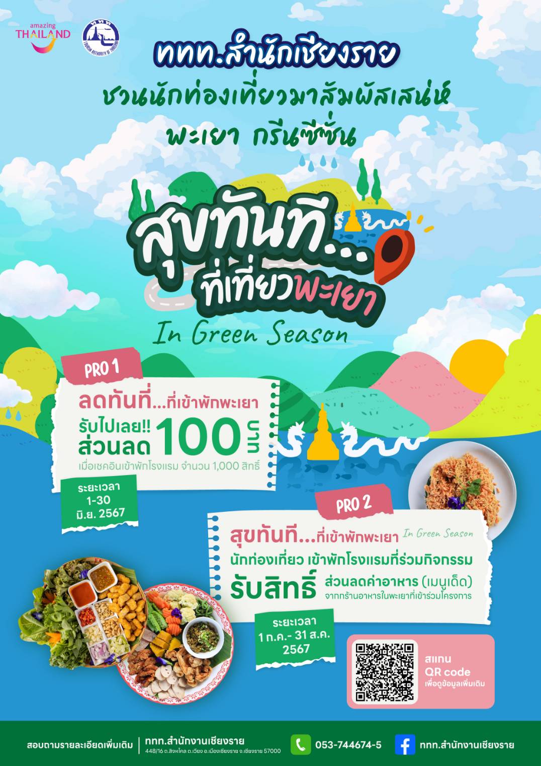 ***ททท. สำนักงานเชียงราย จึงขอเชิญชวนนักท่องเที่ยว เดินทางมาสัมผัสการท่องเที่ยวจังหวัดเชียงรายและพะเยา ในช่วง Green Season และรับส่วนลด สิทธิพิเศษมากมาย สอบถามรายละเอียดหรือติดตามข่าวสารได้ที่ ททท. สำนักงานเชียงราย โทร 0 5371 7433, 0 5374 4674-5 ค้นหาแหล่งท่องเที่ยวจังหวัดพะเยาได้ที่เว็บไซต์ www.tourismchiangrai-phayao.com, www.checkinphayao.com , เพจ Facebook : ททท.สำนักงานเชียงราย