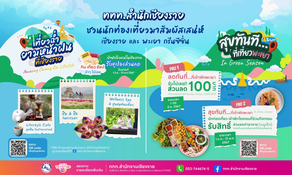 ***ทั้งนี้ ททท.สำนักงานเชียงราย กำหนดเปิดฤดูกาลท่องเที่ยวช่วง Green Season โดยเชิญชวนนักท่องเที่ยวมาท่องเที่ยวมาพักผ่อนเติมเต็มความสุขที่หลากหลาย และพักค้างในจังหวัดเชียงราย และพะเยา ภายใต้แคมเปญ “เที่ยวฉ่ำยามหน้าฝนที่เชียงราย” และ “สุขทันทีที่เที่ยวพะเยา In Green Season ในห้วงเดือนมิถุนายน-สิงหาคม 2567 ซึ่งนักท่องเที่ยวจะได้สัมผัสประสบการณ์ ความสุขทันที….ที่เที่ยวเชียงราย-พะเยา In Green Season สุขที่ได้มาพักผ่อนช่วงหน้าฝนที่ชุ่มฉ่ำ สดชื่น สบายตา อากาศเย็นสบาย สุขที่ได้จิบกาแฟยามเช้าชมพระอาทิตย์ขึ้นท่ามกลางป่าเขา ทุ่งนาเขียวขจี ชมทะเลหมอกหลังฝน ซึ่งทั้งสองเมืองนี้งดงามไม่แพ้ที่ใดๆ สุขที่ได้มาสัมผัสกับประสบการณ์ใหม่ๆ ในกิจกรรมท่องเที่ยวโดยชุมชน สุขที่ได้มาชิมอาหารพื้นเมืองแสนอร่อยที่มีอัตลักษณ์เฉพาะถิ่นในจังหวัดเชียงราย และพะเยา สุขที่ได้รับส่วนลดค่าที่พัก,