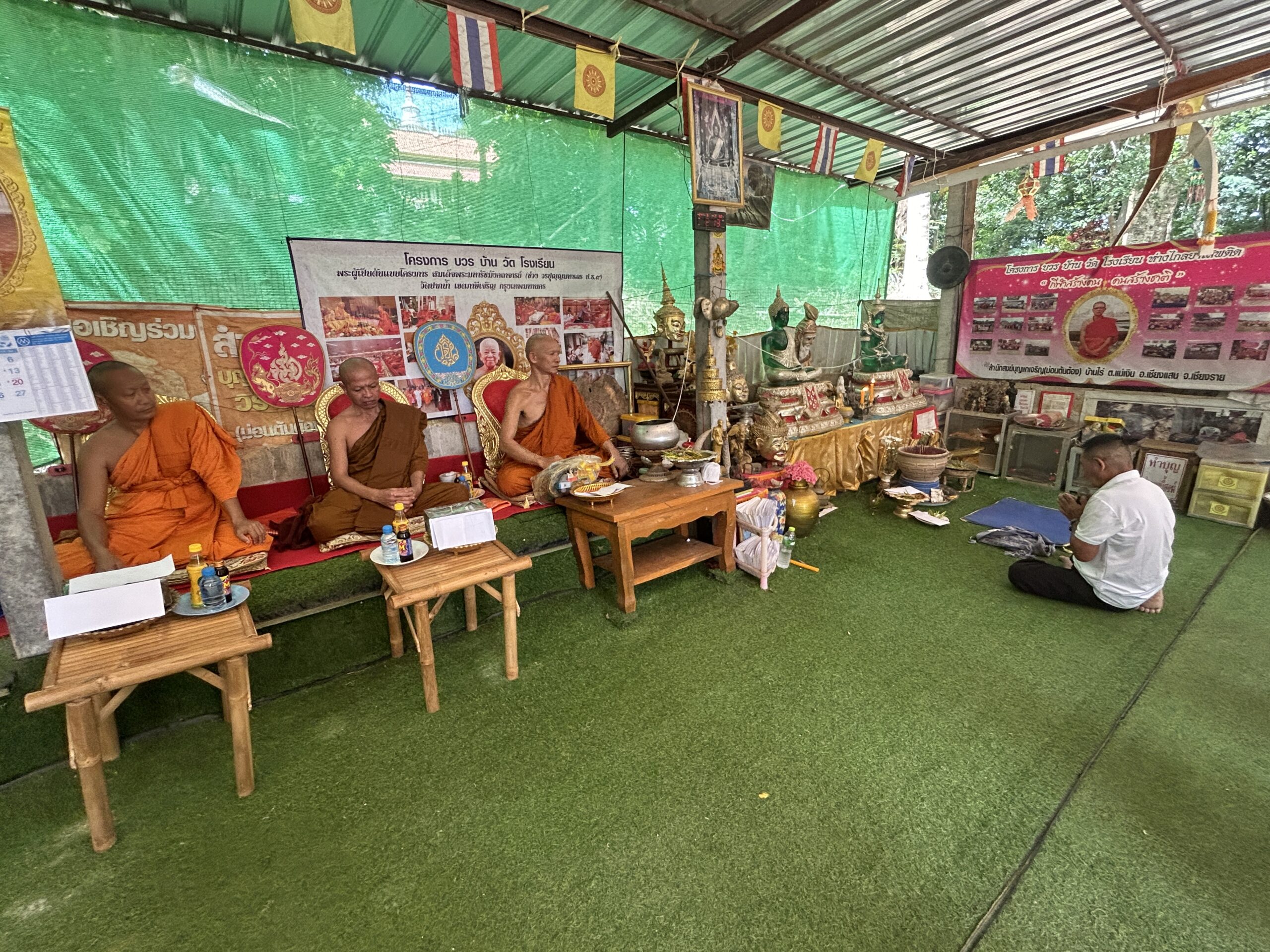***ในการนี้ พระเมธวัจน์ พุทธิโก เจ้าสำนักสงฆ์บุญพาเจริญ (ม่อนต้นต้อง) ได้อนุโมทนาบุญแก่คณะผู้นำถวายพระพุทธบาตรสลักหินเขียว และระฆัง พระสงฆ์ 10 รูป นำโดยพระอธิการสุขคำ สุขจิโต เจ้าอาวาสวัดบ้านไร่ สวดเจริญพระพุทธมนต์ สวดบังสุกุลให้ผู้ล่วงลับตามประสงค์ของเจ้าภาพ สวดอนุโมทนา หลังจากนั้นคณะทั้งนั้นได้ทำพิธีถวายพระพุทธบาทหินเขียวและระฆังที่ลานประดิษฐานแด่ พระเมธวัจน์ พุทธิโก เจ้าสำนักสงฆ์บุญพาเจริญ (ม่อนต้นต้อง) เป็นอันเสร็จพิธี