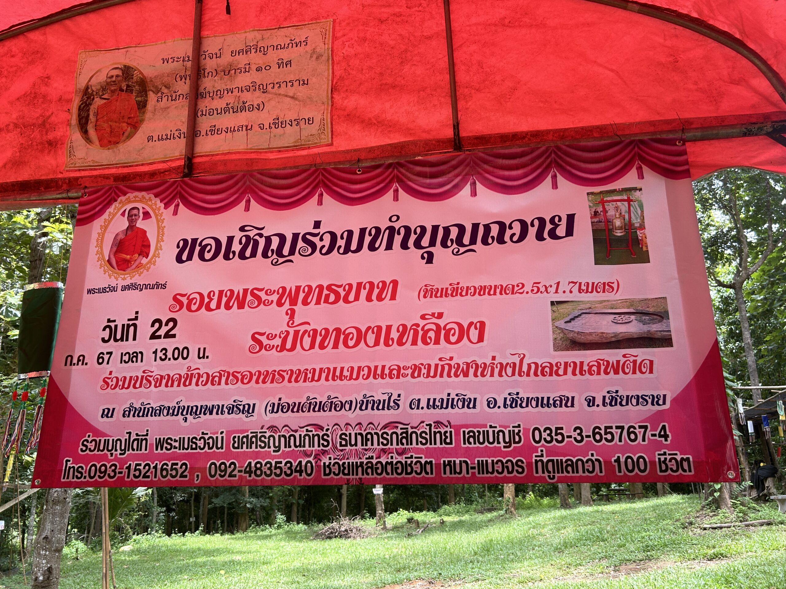 ภาคธุรกิจถวายระฆัง-รอยพระพุทธบาทหินเขียว “หลวงพี่เอก” สำนักสงฆ์บุญพาเจริญ เชียงแสน บอกบุญบูรณะศาลาพระธาตุ 100 ปี พายุถล่ม ปัจจัยอาหารหมาแมวที่มีคนมาปล่อยหลายสิบตัว