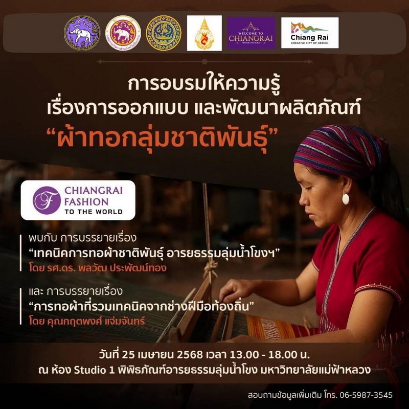 ***เมื่อวันที่ 25 เมษายน 2568 ณ ห้อง Studio 1 พิพิธภัณฑ์อารยธรรมลุ่มน้ำโขง มหาวิทยาลัยแม่ฟ้าหลวง จังหวัดเชียงราย โดยหัวหน้าสำนักงานจังหวัดเชียงราย (นายนิพนธ์ นิยม) เป็นประธานเปิดงานอบรมครั้งที่ 1 “อบรมการออกแบบและพัฒนาผลิตภัณฑ์ผ้าทอกลุ่มชาติพันธุ์เพื่อขับเคลื่อน นโยบายที่ 7 ศูนย์เศรษฐกิจสร้างสรรค์ (TCDC) สร้างเชียงรายแบรนด์สู่ตลาดโลกภายใต้โครงการ Chiang Rai Fashion to the World Season 3 ” พร้อมด้วย องค์การบริหารส่วนจังหวัดเชียงราย มหาวิทยาลัยแม่ฟ้าหลวง และ บริษัท เวลคัม ทู เชียงราย (TRADER CHIANG RAI) จัดการอบรมให้ความรู้แก่นักเรียนโรงเรียนนานาชาติเวลลิงตันคอลเลจ กรุงเทพ และ นักศึกษามหาวิทยาลัยแม่ฟ้าหลวง เข้าร่วมอบรมเรื่องการออกแบบ และผ้าทอกลุ่มชาติพันธุ์ ให้แก่กลุ่มนักออกแบบ ดีไซน์เนอร์เยาวชนคนรุ่นใหม่ ที่สร้างแรงบันดาลใจและพัฒนาออกแบบผ้าทอกลุ่มชาติพันธุ์ สร้างเชียงรายแบรนด์สู่ตลาดโลก ภายใต้โครงการ Chiang Rai Fashion to The World Season 3