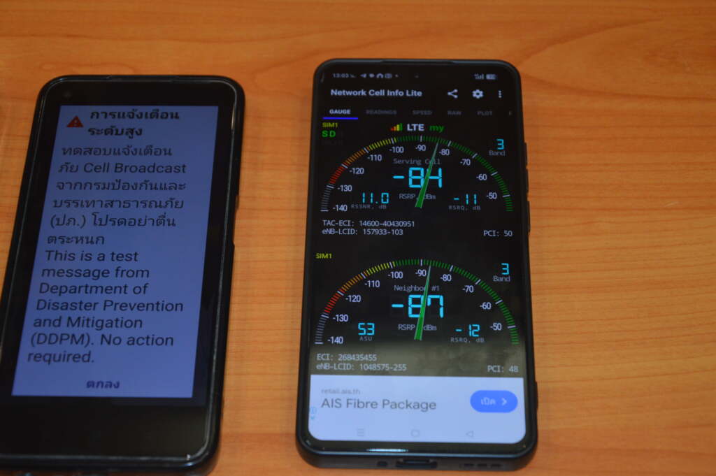 ***แม้ว่ามือถือ 2G / 3G จะไม่รองรับ Cell Broadcast โดยตรง แต่ NT จะส่งข้อความ SMS แทนในกรณีที่อุปกรณ์ของลูกค้าไม่รองรับ CB เพื่อให้แน่ใจว่าทุกคนได้รับข้อมูลแจ้งเตือนภัยอย่างทั่วถึงภายในเป้าหมายที่ตกลงไว้คือไม่เกิน 10 นาที (แต่สำหรับการทดสอบครั้งนี้จะยังไม่ส่ง SMS)