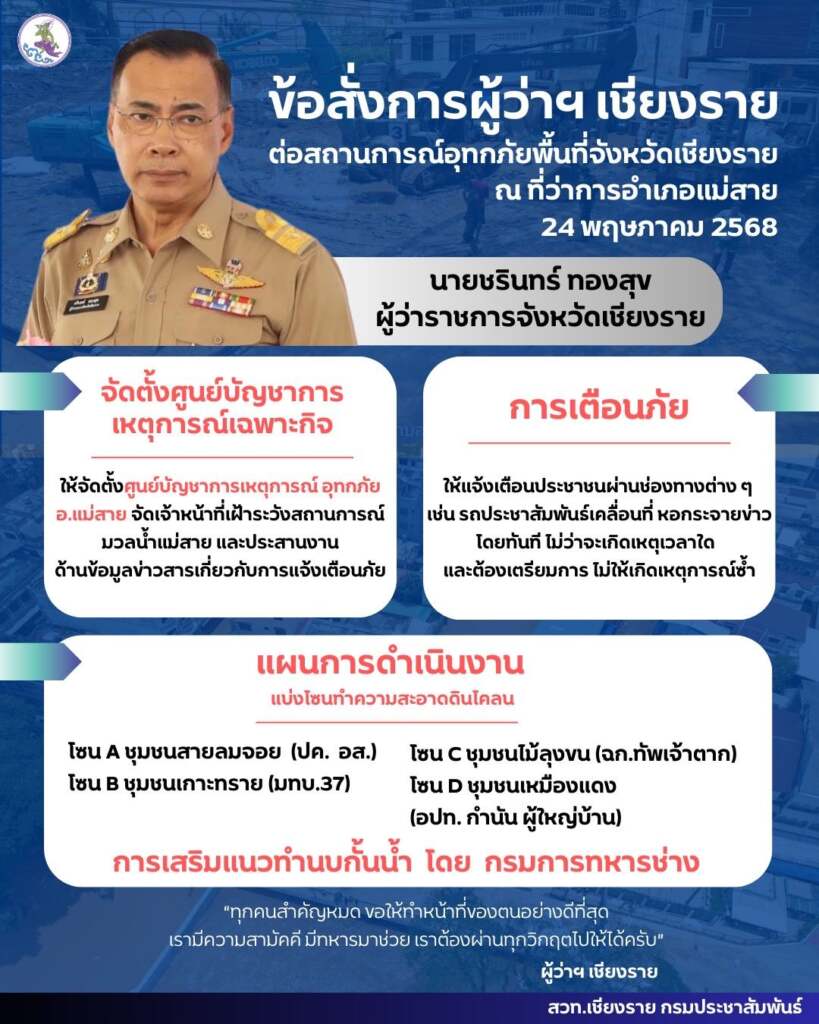 ***นอกจากนี้ นายชรินทร์ ทองสุข ผู้ว่าราชการจังหวัดเชียงราย ยังได้สั่งการให้มีการจัดตั้งศูนย์บัญชาการเหตุการณ์เฉพาะกิจ ที่อำเภอแม่สาย เพื่อดูแลในทุกด้านโดยเฉพาะข้อมูลข่าวสารที่เกี่ยวกับการแจ้งเตือนภัย และขอให้มีการเตือนภัยผ่านช่องทางต่างๆทั้งรถประชาสัมพันธ์เคลื่อนที่และให้เปิดหอกระจายข่าว ไม่ว่าจะเกิดเหตุเวลาใด ต้องเปิดแจ้งเตือนประชาชนได้ทันทีตลอด 24 ชั่วโมง และต้องมีการเตรียมการไม่ให้เกิดเหตุซ้ำ