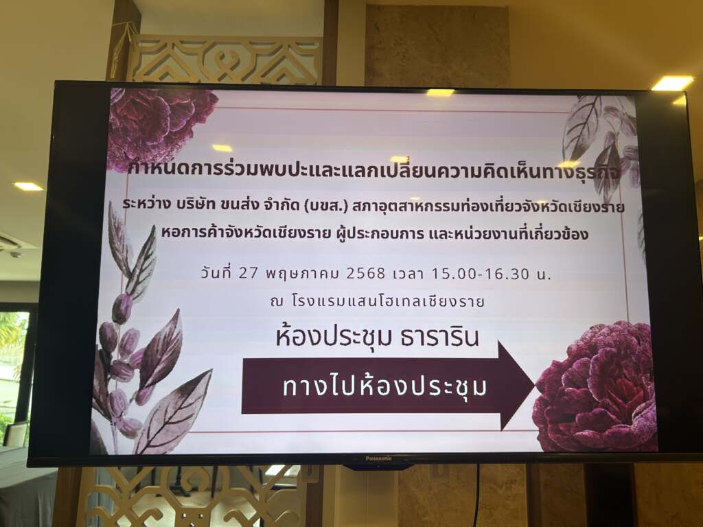 ***เมื่อเวลา 15.00 ร. วันที่ 27 พฤษภาคม 2568 ที่ห้องประชุมธาราริน โรงแรมแสนโฮเทล อ.เมืองเชียงราย นายชัชวาล พรอมรธรรม กรรมการฯ รักษาการแทนกรรมการผู้จัดการใหญ่ บริษัท ขนส่ง จำกัด (บขส.) พร้อมด้วยคณะผู้บริหาร นายสถานีเดินรถในพื้นที่กลุ่มจังหวัดภาคเหนือและเจ้าหน้าที่ บขส. ร่วมประชุมพบปะแลกเปลี่ยนความคิดเห็นทางธุรกิจการเดินรถชยส่งผู้โดยสารและพัสดุภัณฑ์เชื่อมโยงการท่องเที่ยวกับผู้ประกอบการท่องเที่ยวจังหวัดเชียงราย โดยมี นางนงเยาว์ เนตรประสิทธิ์ รองประธานฝ่ายการตลาดในประเทศ สภาอุตสาหกรรมท่องเที่ยวแห่งประเทศไทย และนายกสมาคมสหพันธ์ท่องเที่ยวภาคเหนือ นายวิโรจน์ ชายา ประธานสภาอุตสาหกรรมท่องเที่ยวจังหวัดเชียงราย ว่าที่ร.ต.เมฆา สิริชัยรุ่งเรือง นายกสมาคมธุรกิจท่องเที่ยวจังหวัดเชียงราย พร้อมผู้ประกอบการธุรกิจท่องเที่ยวและหน่วยงานที่เกี่ยวข้องร่วมประชุม
