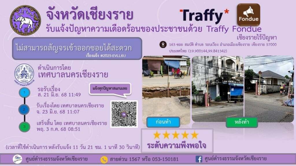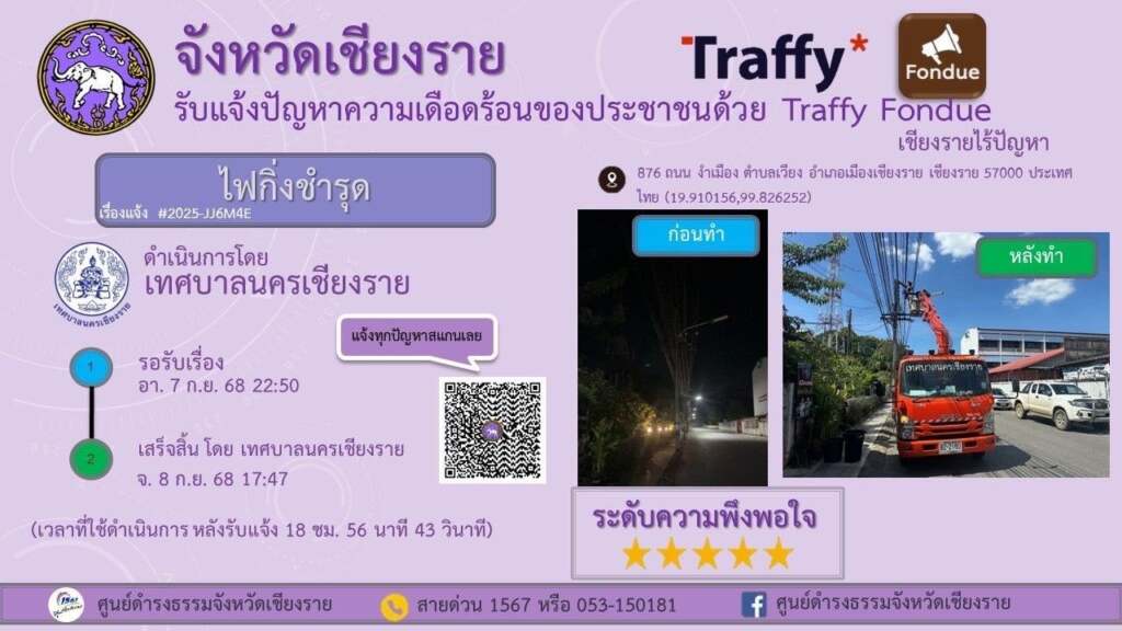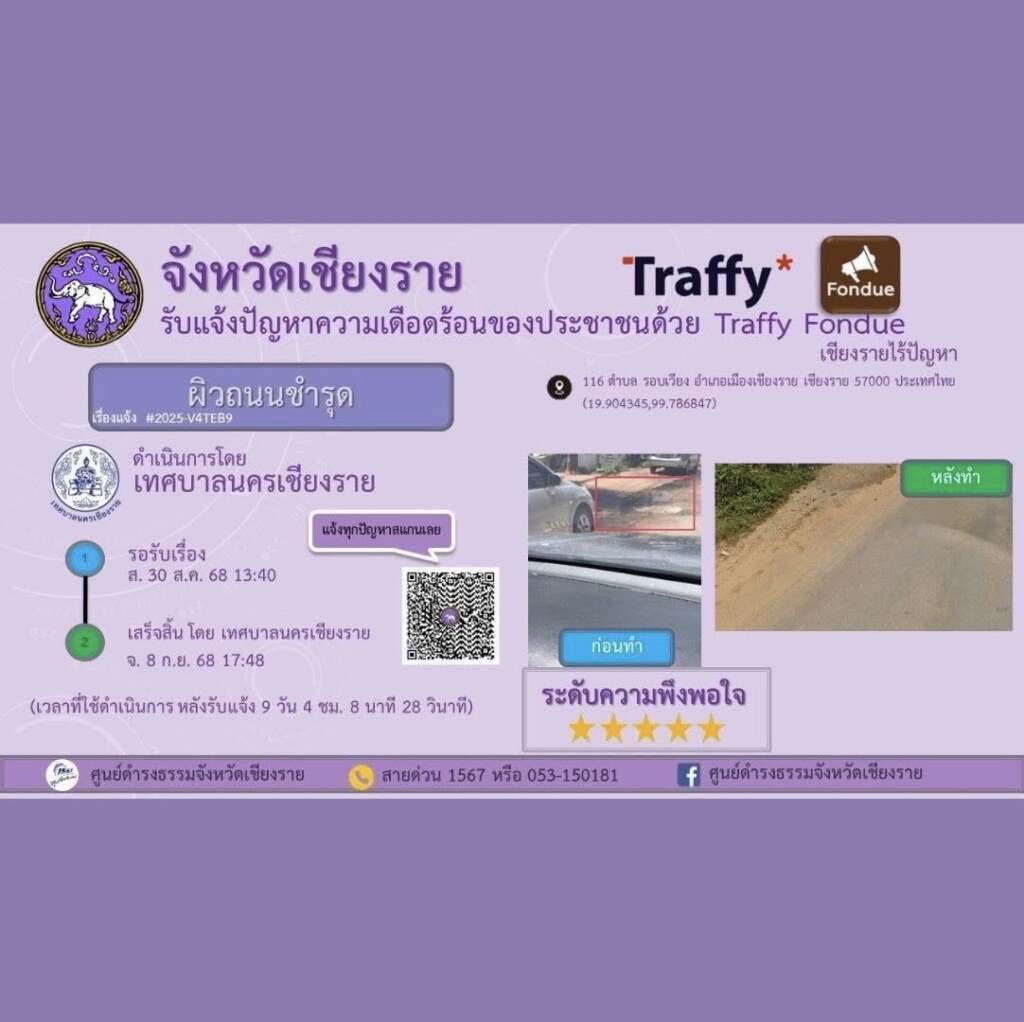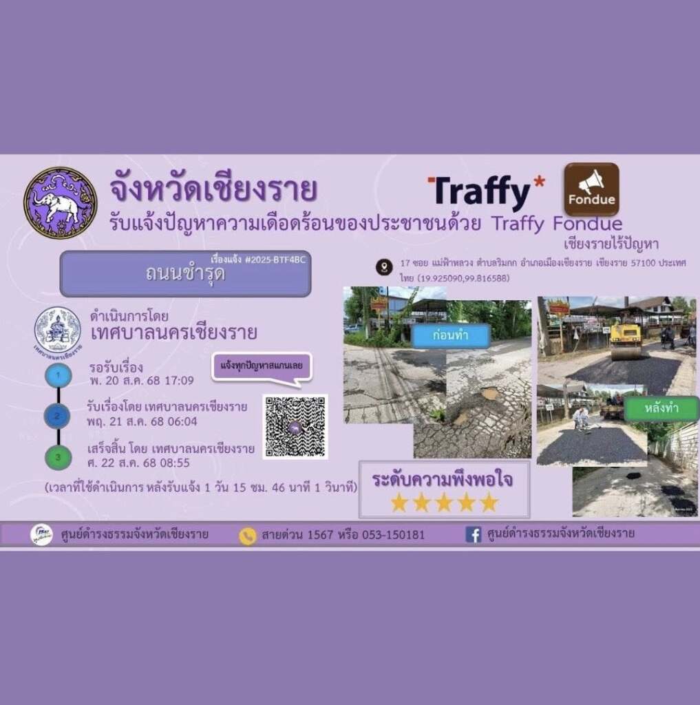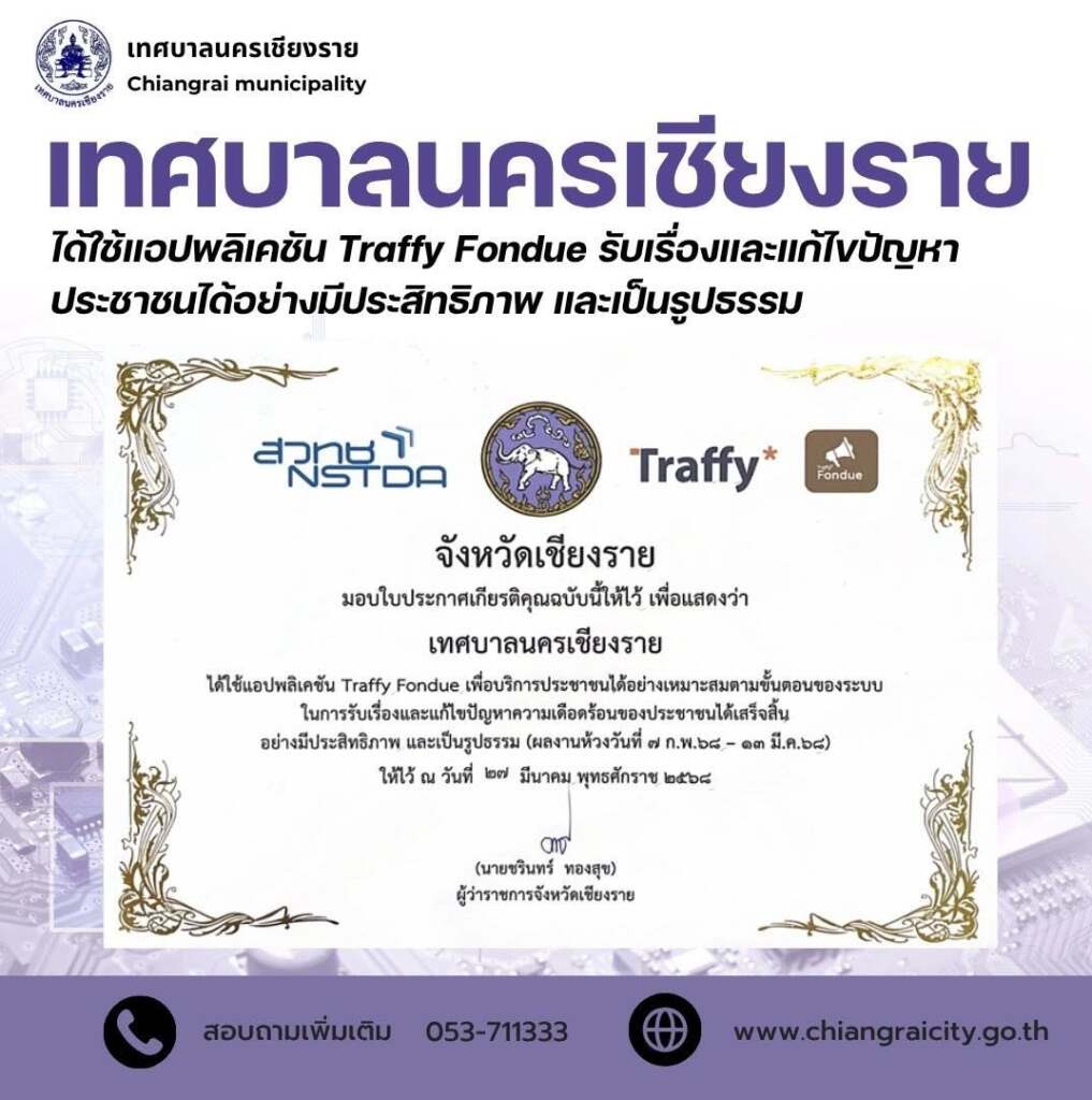 ***เมื่อวันที่ 3 ตุลาคม 2568 เทศบาลนครเชียงรายโดย นายวันชัย จงสุทธานามณี นายกเทศมนตรีนครเชียงราย ได้แจ้งประกาศให้ประชาชนในพื้นที่เทศบาลนครเชียงราย สามารถแจ้งเรื่องราวร้องทุกข์ต่างๆได้ผ่านทางแอปพลิเคชัน Traffy Fondue ซึ่งเป็นเครื่องมือรับเรื่องร้องเรียน และแจ้งปัญหาจากประชาชนในเขตเทศบาล เพื่อให้การบริการเป็นไปอย่างสะดวก รวดเร็ว และโปร่งใส โดยประชาชนสามารถแจ้งปัญหาที่พบในชีวิตประจำวัน ไม่ว่าจะเป็นเรื่องถนนชำรุด ไฟส่องสว่างชำรุด ขยะมูลฝอย น้ำท่วมขัง ตลอดจนปัญหาอื่น ๆ ผ่านระบบออนไลน์ได้ทันที เมื่อมีการแจ้งเรื่องเข้ามา ระบบจะส่งข้อมูลไปยังหน่วยงานที่เกี่ยวข้องของเทศบาลนครเชียงรายเพื่อดำเนินการแก้ไข พร้อมทั้งสามารถติดตามความคืบหน้าได้อย่างต่อเนื่อง ทำให้การแก้ไขปัญหาเป็นรูปธรรมและตรวจสอบได้จริง