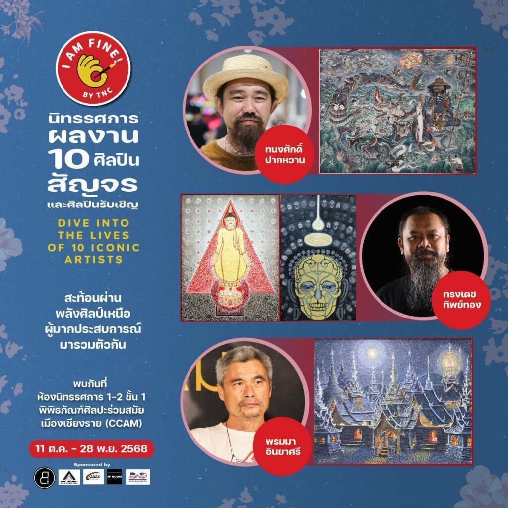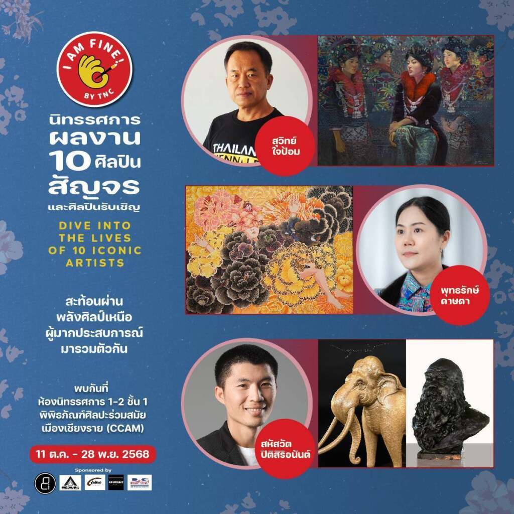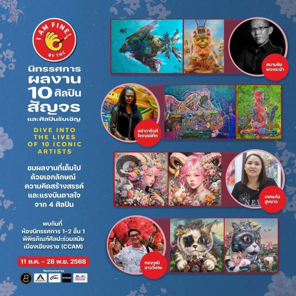 ***กลุ่มTNC ประกาศการกลับมาอย่างยิ่งใหญ่ของนิทรรศการสัญจร “I AM FINE” ครั้งที่ 2 ซึ่งจะจัดขึ้นอย่างเต็มรูปแบบและยิ่งใหญ่กว่าเดิม ด้วยความร่วมมือระหว่างพิพิธภัณฑ์ร่วมสมัยเชียงราย (CCAM) โดยสมาคมขัวศิลปะ และ กลุ่ม TNC.ART กำหนดจัดขึ้นระหว่างวันที่ 11 ตุลาคม ถึง 28 พฤศจิกายน 2568 นี้ ที่จังหวัดเชียงราย ในการนี้ ตัวแทนกลุ่ม TNC เปิดเผยว่า นิทรรศการครั้งนี้จัดขึ้นภายใต้แนวคิด “DIVE INTO THE LIVES OF 10 ICONIC ARTISTS” ซึ่งนำเสนอผลงานเจาะลึกถึงชีวิตและตัวตนของ 10 ศิลปินชั้นแนวหน้าของวงการศิลปะไทย พร้อมด้วยผลงานจากศิลปินรับเชิญผู้ทรงคุณวุฒิและศิลปินคลื่นลูกใหม่ที่น่าจับตามองอีกมากมายรวมกว่า 30ชีวิต ถือเป็นการรวมตัวครั้งสำคัญของศิลปินจากหลากหลายรุ่นและหลายแขนง