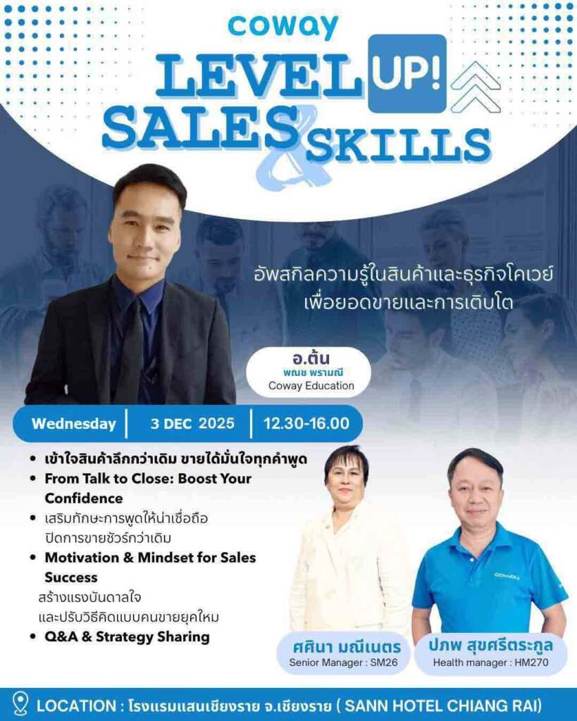 ***เมื่อเวลา 13.30 น. วันที่ 3 ธันวาคม 2568 ที่ห้องธาราริน โรงแรมแสน อ.เมืองเชียงราย บริษัท โคเวย์ (ประเทศไทย) จำกัด ผู้ผลิตเครื่องกรองอากาศและเครื่องกรองน้ำโคเวย์มาตรฐานโลกจากประเทศเกาหลีใต้ จัดการอบรมให้ความรู้เดี่ยวกับผลิตภัณฑ์โคเวย์และแนะนำการทำธุรกิจเพื่อสร้างรายได้ที่มั่นคงเกี่ยวกับสุขภาพที่ดีของทุกคนจากน้ำและอากาศ พร้อมแนะนำผลิตภัณฑ์เครื่องกรองน้ำและเครื่องกรองอากาศรุ่นใหม่ที่ให้ความสะดวกสบายและมั่นใจในราคาที่สัมผัสได้ด้วยระบบ Subscription และผลิตภัณฑ์ใหม่ ได้แก่ เครื่องกรองน้ำใช้แบบติดตั้งจากต้นทางน้ำเพื่อใช้ภายในบ้าน เครื่องกรองน้ำที่สามารถทำน้ำเย็น น้ำร้อน และน้ำแข็งได้ในเครื่องเดียว เครื่องกรองอากาศดับกลิ่นฆ่าเชื้อในตัว และแอร์คอร์ดิชั่นมาตรฐานกรองอากาศบริสุทธิ์ โดยมี “อ.ต้น” นายรณช พรามณี (Ciway Education) เป็นวิทยากร นายปภพ สุขศรีตระกูล (Health Manager : HM270) ผู้จัดการศูนย์โคเวย์เชียงราย ให้การต้อนรับสมาชิกศูนย์และผู้สนใจทำธุรกิจที่เข้าร่วมการอบรม