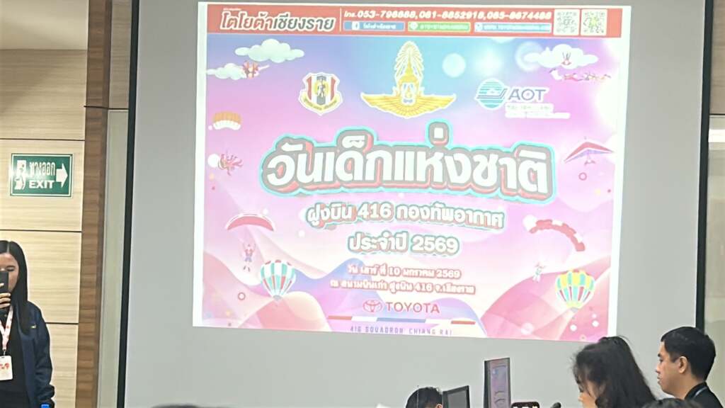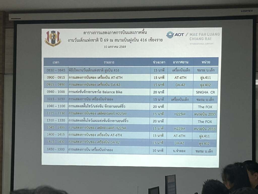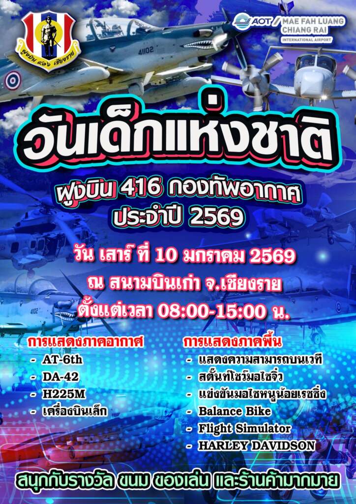 ***การจัดกิจกรรมวันเด็กแห่งชาติประจำปี 2569 ณ ฝูงบิน 416 (เชียงราย) เริ่มงานตั้งแต่เวลา 08.00 – 15.00 น. โดยพิธีเปิดงานเวลา 08.30 น. ต่อเนื่องด้วยกิจกรรมการแสดงภาคอากาศและภาคพื้น ประกอบด้วย การแสดงการบินของเครื่องบิน AT – 6TH , เครื่องบิน DA – 42 , เครื่องบินจำลอง , เฮลิคอปเตอร์ H225M รวมถึงการแข่งขันจักรยานขาไถ Balance Bike , การแสดงสตั๊นโชว์ / แข่งขันจักรยานยนต์จิ๋ว การแสดงความสามารถบนเวที, การจัดแสดงยุทธโธปกรณ์ อุปกรณ์ที่น่าสนใจ , การตอบปัญหาชิงรางวัล และการจัดบูธนิทรรศการให้ความรู้จากหน่วยงานด้านกิจกรรมการบินของ หน่วยงานภาครัฐ ภาคเอกชน ผู้ประกอบการ และสมาคมต่าง ๆ ภายในจังหวัดเชียงราย