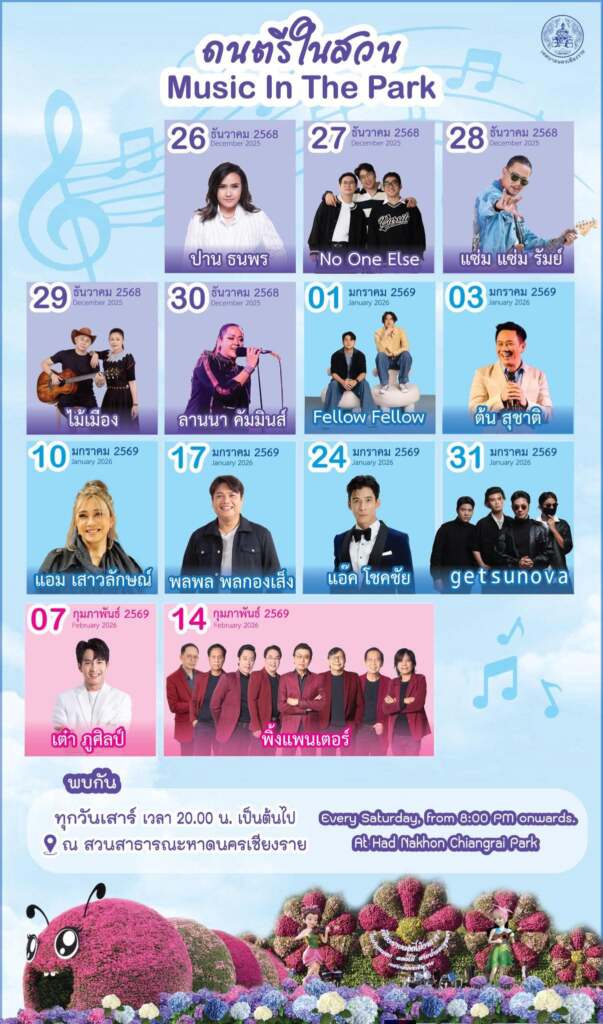 ***สำหรับการแสดงมินิคอนเสิร์ต ดนตรีในสวนในวันต่างๆมีดังนี้ 27 ธ.ค.68 No One Else 28 ธ.ค.68 แช่ม แช่มรัมย์ 29 ธ.ค.68 ไม้เมือง 30 ธ.ค.68 ลานนา คัมมินส์ 1 ม.ค.69 Fellow Fellow 3 ม.ค.69 ต้น สุชาติ ชวางกูร 10 ม.ค.69 แอม เสาวลักษณ์ 17 ม.ค.69 พลพล พลกองเส็ง 24 ม.ค.69 แอ็ค โชคชัย 31 ม.ค.69 Getsunova 7 ก.พ.69 เต๋า ภูศิลป์ 14 ก.พ.69 พิ้งแพนเตอร์